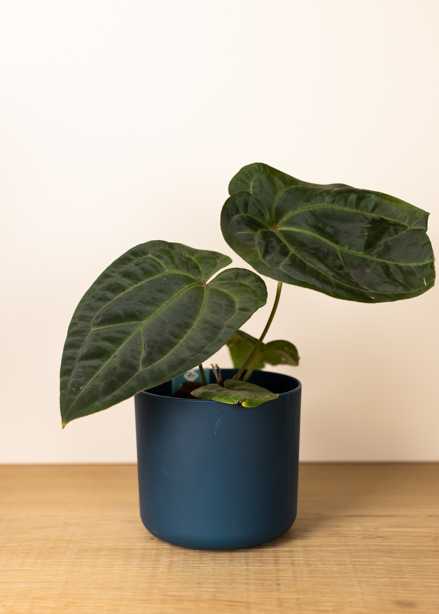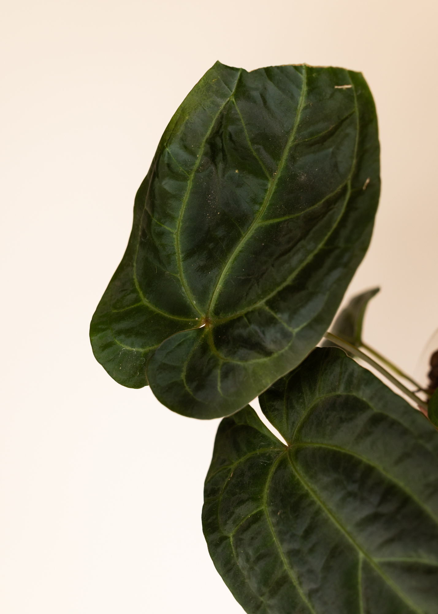 Dieses Anthurium NoID besticht durch seine dunklen, herzförmigen Blätter mit samtiger Oberfläche und hervortretenden, helleren Blattadern. Der Kontrast zwischen dem fast schwarzen Grün und den prominenten Venen verleiht der Pflanze eine dramatische, luxuriöse Ausstrahlung – ein echter Blickfang für alle, die Blattschmuckpflanzen mit Charakter lieben.