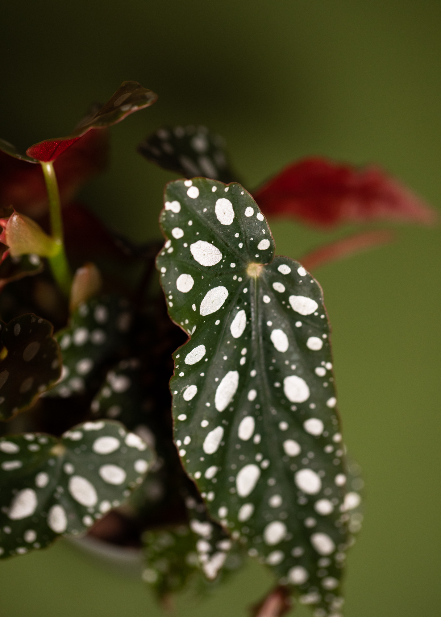 Die Begonia maculata ist ein absoluter Klassiker unter den Blattschmuckpflanzen und sofort an ihren charakteristischen silberweißen Punkten auf olivgrünen Blättern zu erkennen. Die tiefrote Blattunterseite bildet einen starken Kontrast und verleiht der Pflanze eine besonders elegante, fast grafische Wirkung.