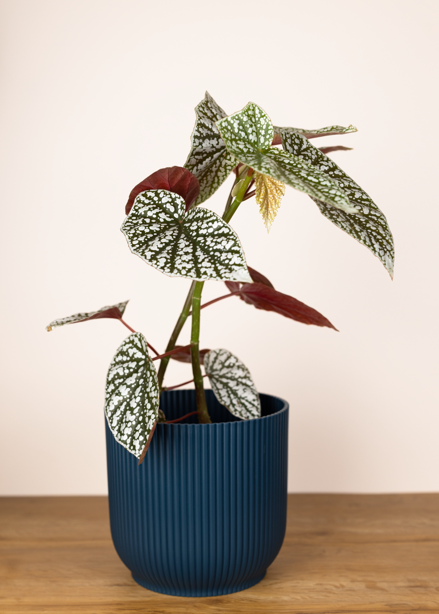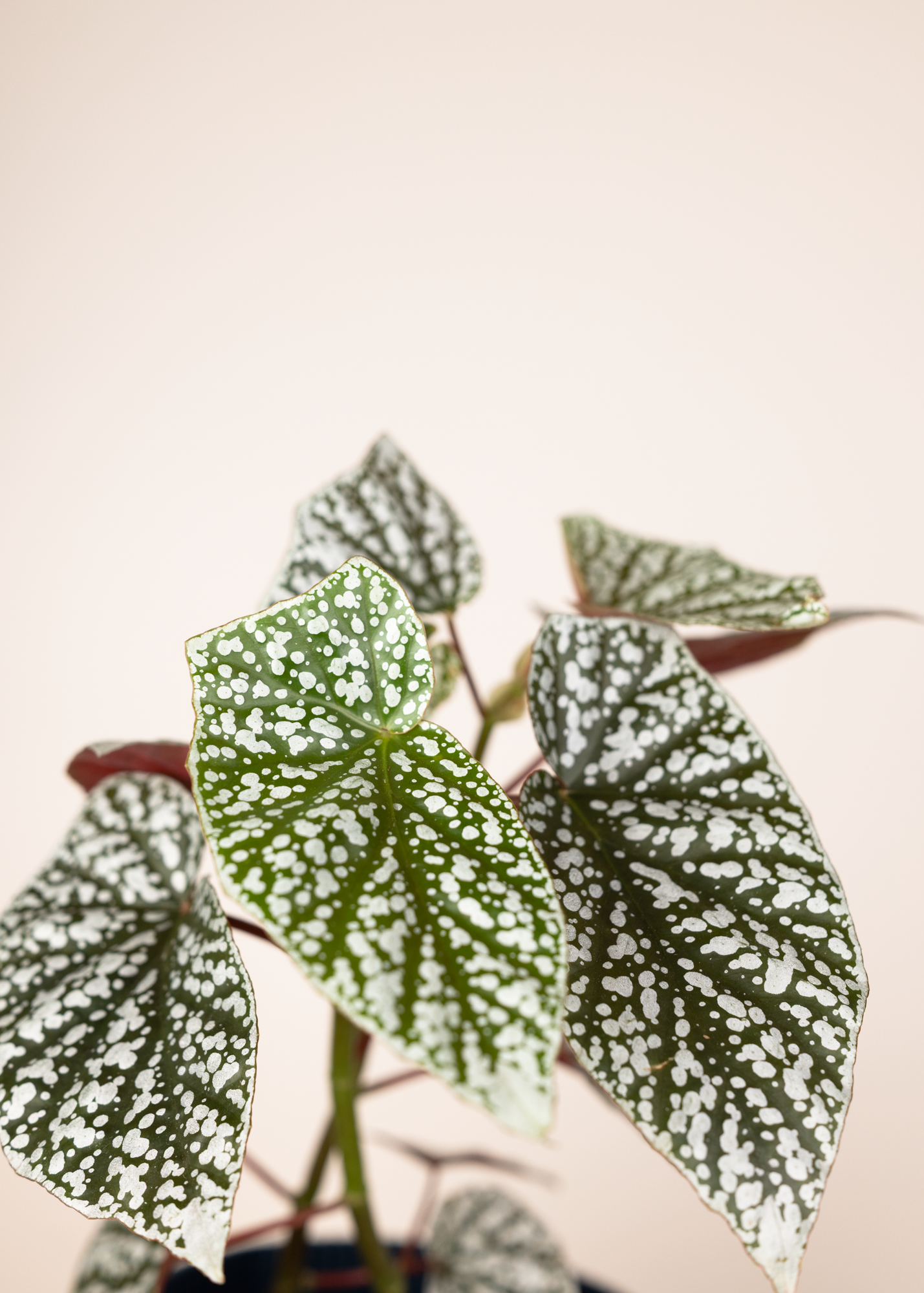 Die Begonia ‘Snowcap’ ist eine elegante Blattschönheit mit außergewöhnlicher Zeichnung. Ihre dunklen, oft tiefgrünen bis leicht rötlichen Blätter sind mit feinen, hellen Sprenkeln überzogen – als wären sie von einem zarten Schneeschleier bedeckt. Dieser Kontrast verleiht der Pflanze eine ruhige, gleichzeitig spannende Ausstrahlung.