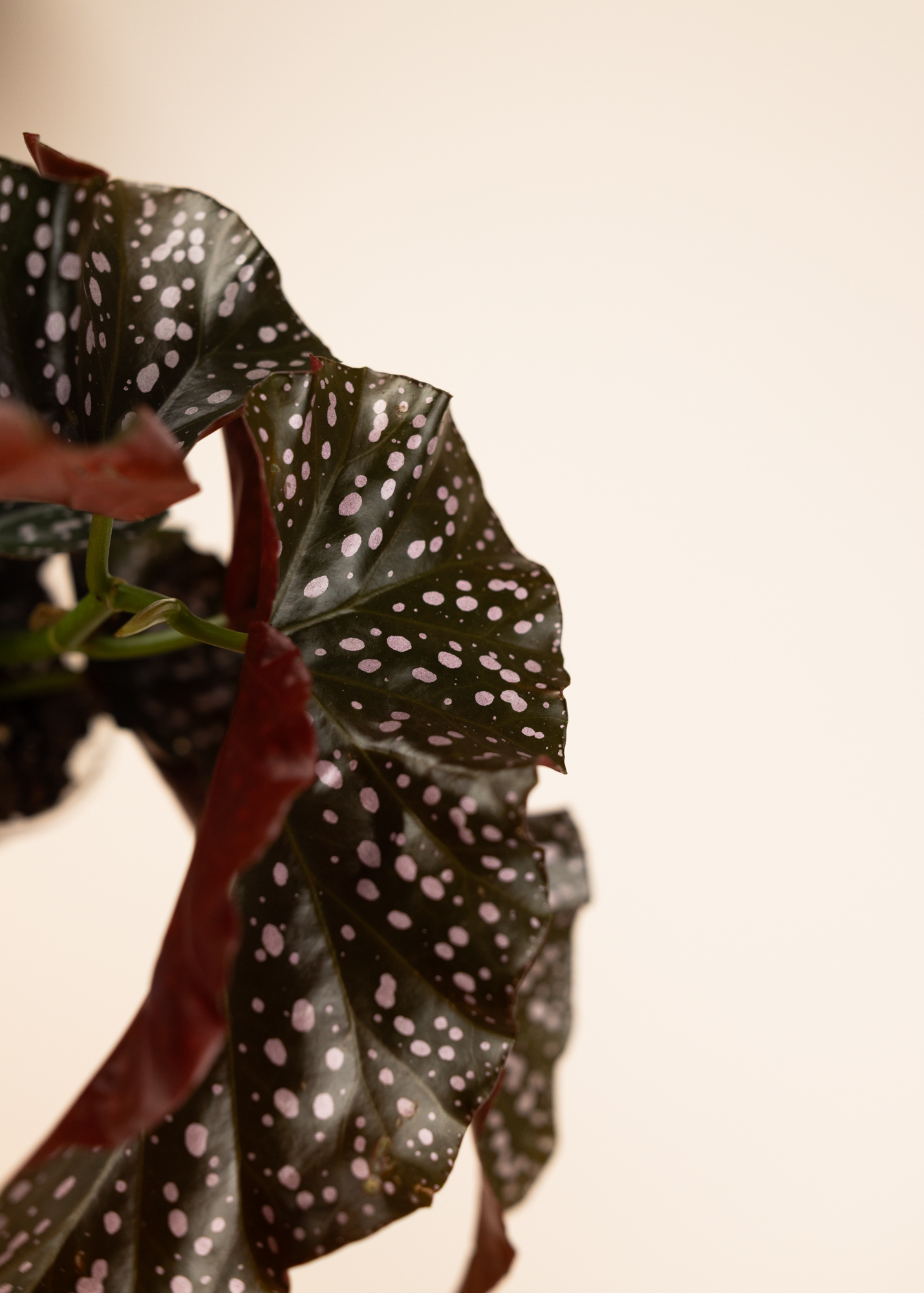 Die Begonia ‘Cracklin’ Rose’ ist eine außergewöhnliche Blattschmuckbegonie mit stark strukturierten, spiralig gewellten Blättern, die sofort ins Auge fallen. Die Oberfläche zeigt ein intensives Farbspiel aus Rosa, Silber und Dunkelgrün.
