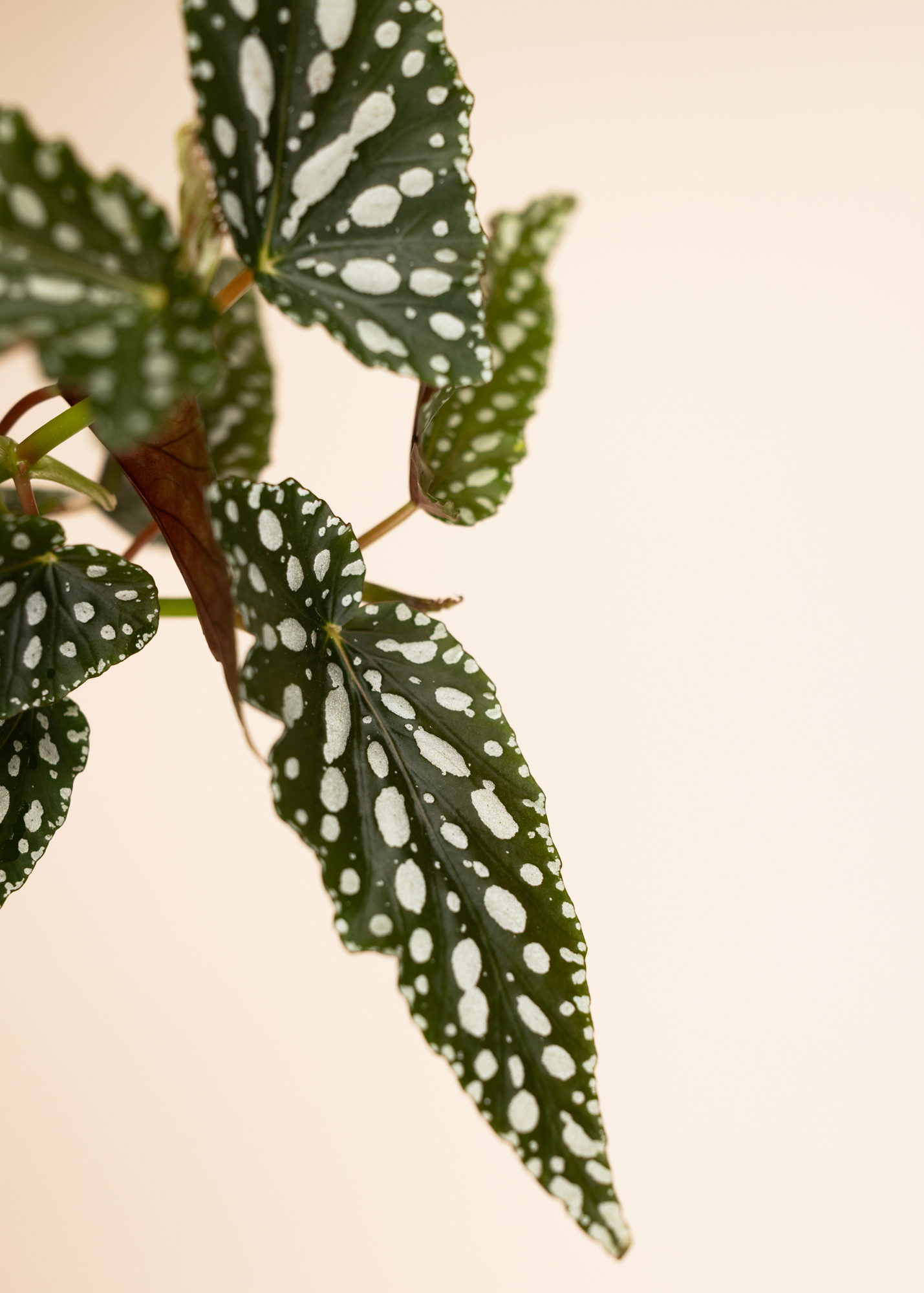 Diese Begonia Hybrid erinnert optisch an die klassische Forellenbegonie (Begonia maculata), ohne eindeutig dieser Art zugeordnet zu sein. Die länglich geformten, olivgrünen Blätter zeigen eine helle, punktartige Zeichnung, die an die typische Tupfung der Maculata erinnert. Je nach Exemplar können Form, Punktgröße und Blattfarbe leicht variieren – ein Zeichen ihres hybriden Ursprungs.