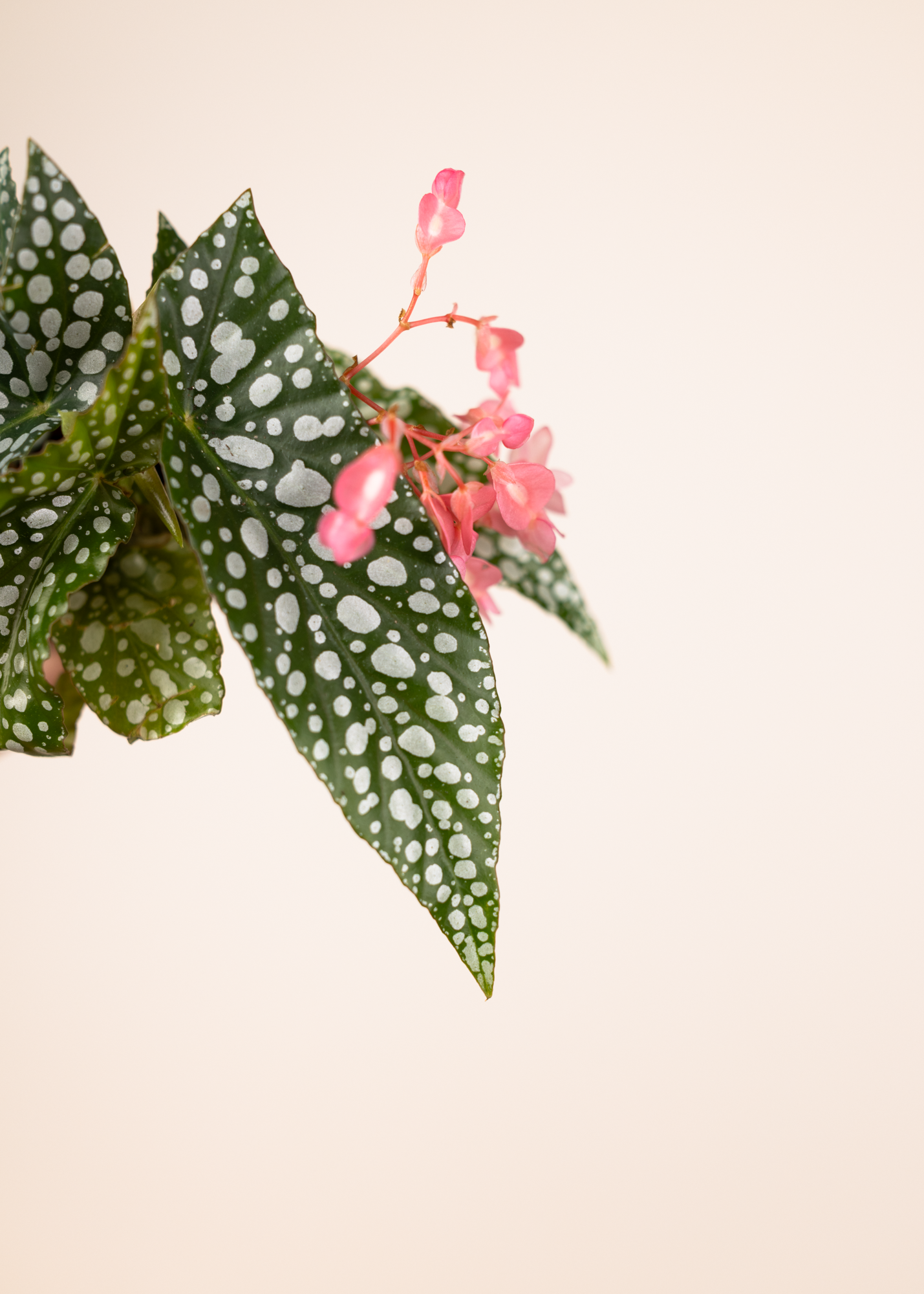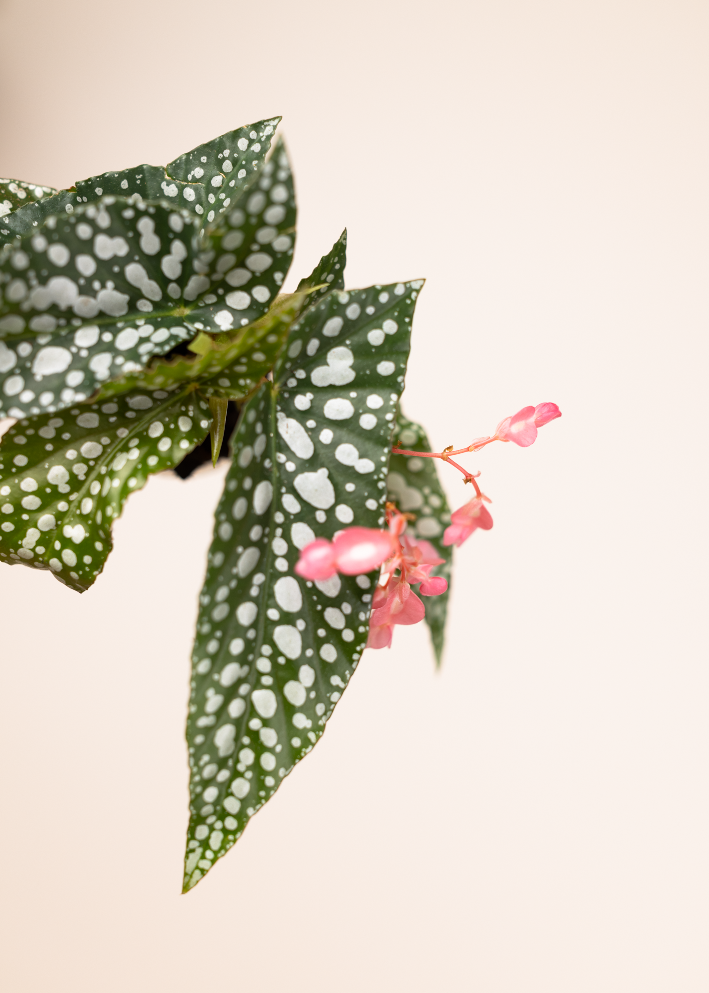 Die Begonia maculata ‘White Ice’ ist eine der ikonischsten Begonien und ein echter Klassiker unter den Blattschönheiten. Ihre länglichen, olivgrünen Blätter sind mit leuchtend weißen Punkten übersät, während die Blattunterseiten oft einen rötlichen Farbton zeigen – ein spannender Kontrast mit hoher Wiedererkennbarkeit.