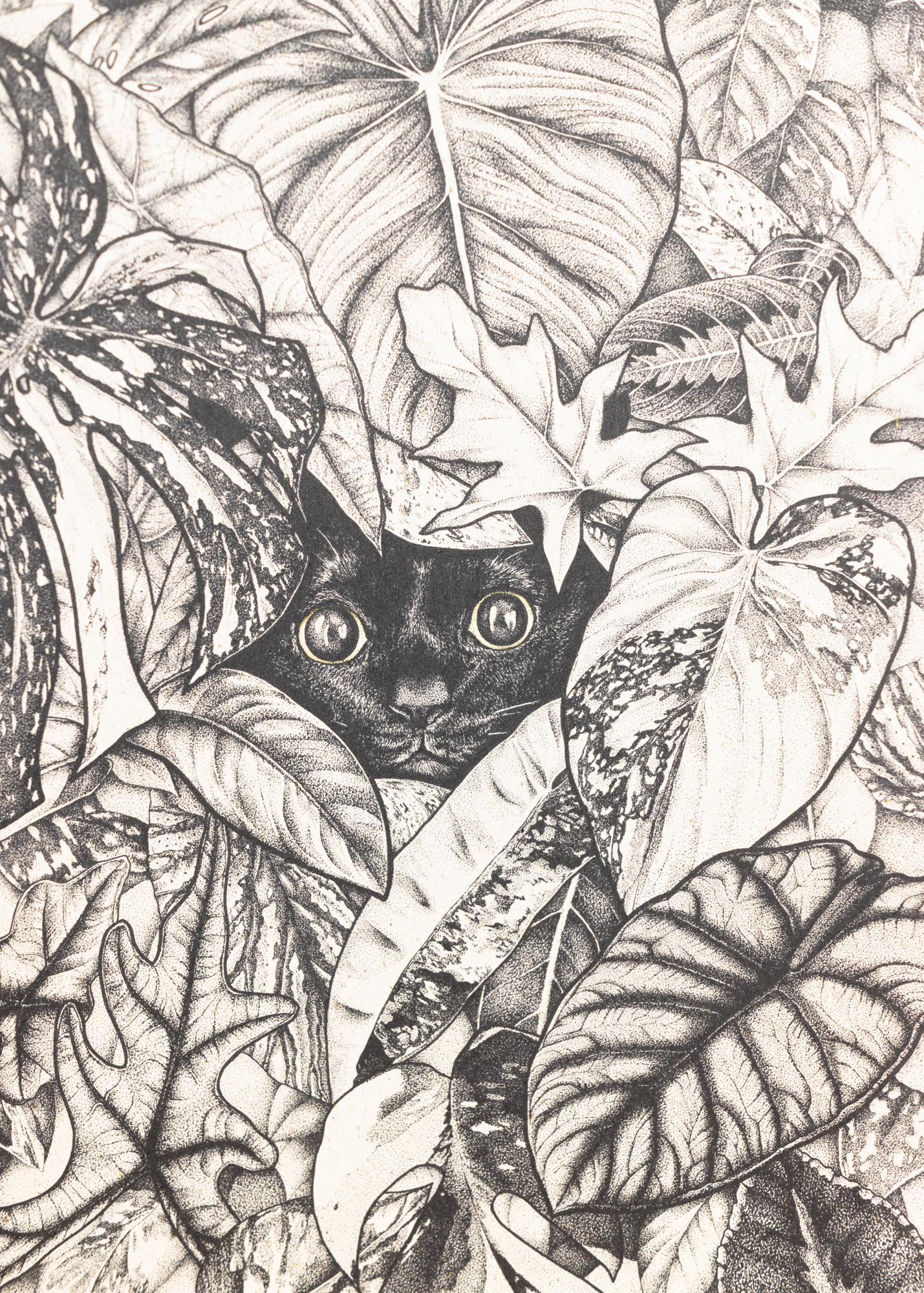 Dieser hochwertige A4-Druck „Stalker Cat“ von artiges Kind zeigt eine neugierige Katze, die sich halb verborgen im dichten Pflanzen-Dschungel aufhält und aufmerksam durch das Blattwerk späht. Nur ein Teil ihres Körpers ist sichtbar – genau dieser Moment zwischen Verstecken und Beobachten macht das Motiv so lebendig und charakterstark.