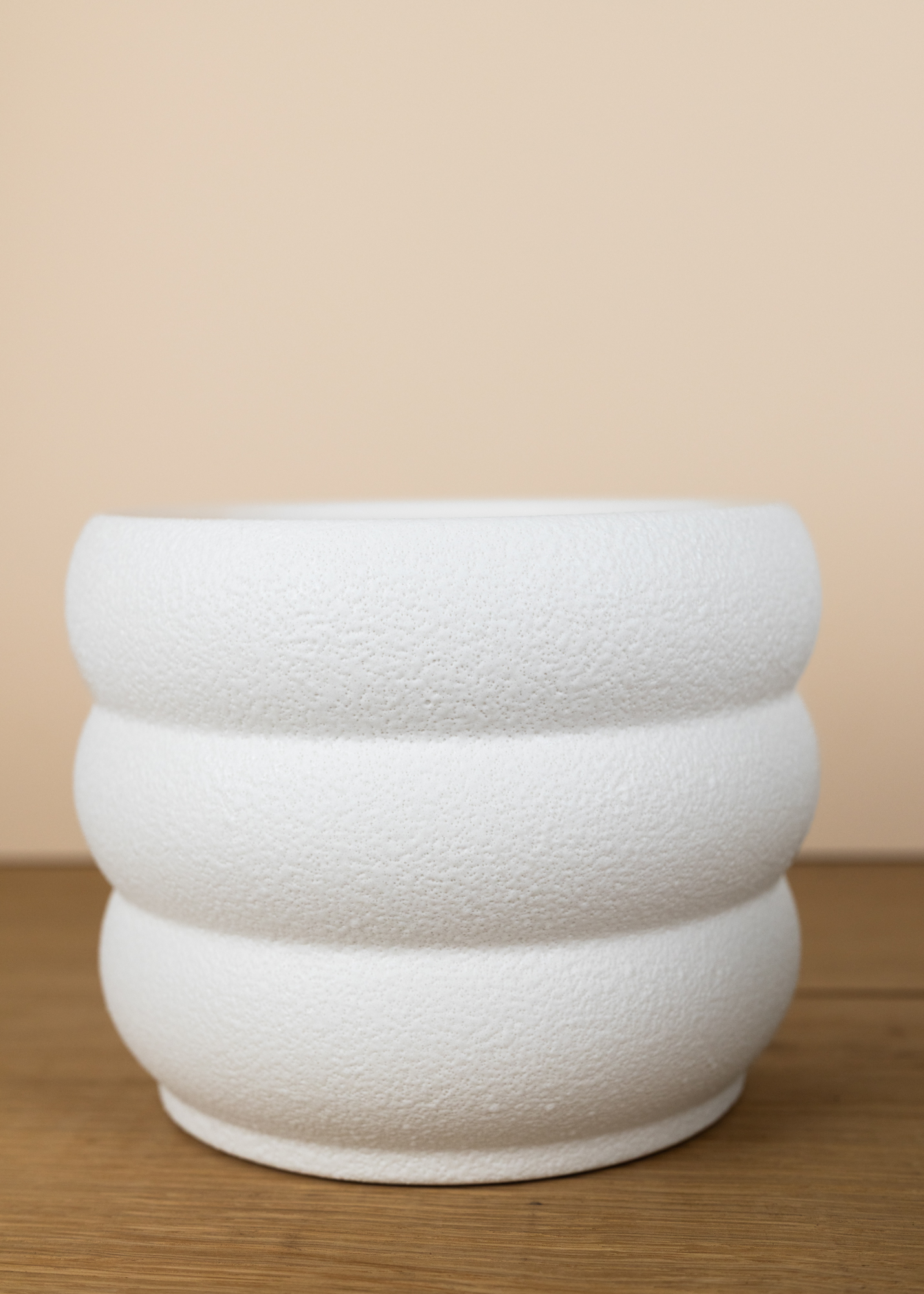 Das dezente Oberflächendetail verleiht dem Übertopf Tiefe und Charakter, ohne aufdringlich zu wirken. Gefertigt aus hochwertiger Keramik, ist er vollständig wasserdicht und ideal für den Einsatz im Innenbereich geeignet. Pflanzen kommen darin besonders ruhig, modern und natürlich zur Geltung.