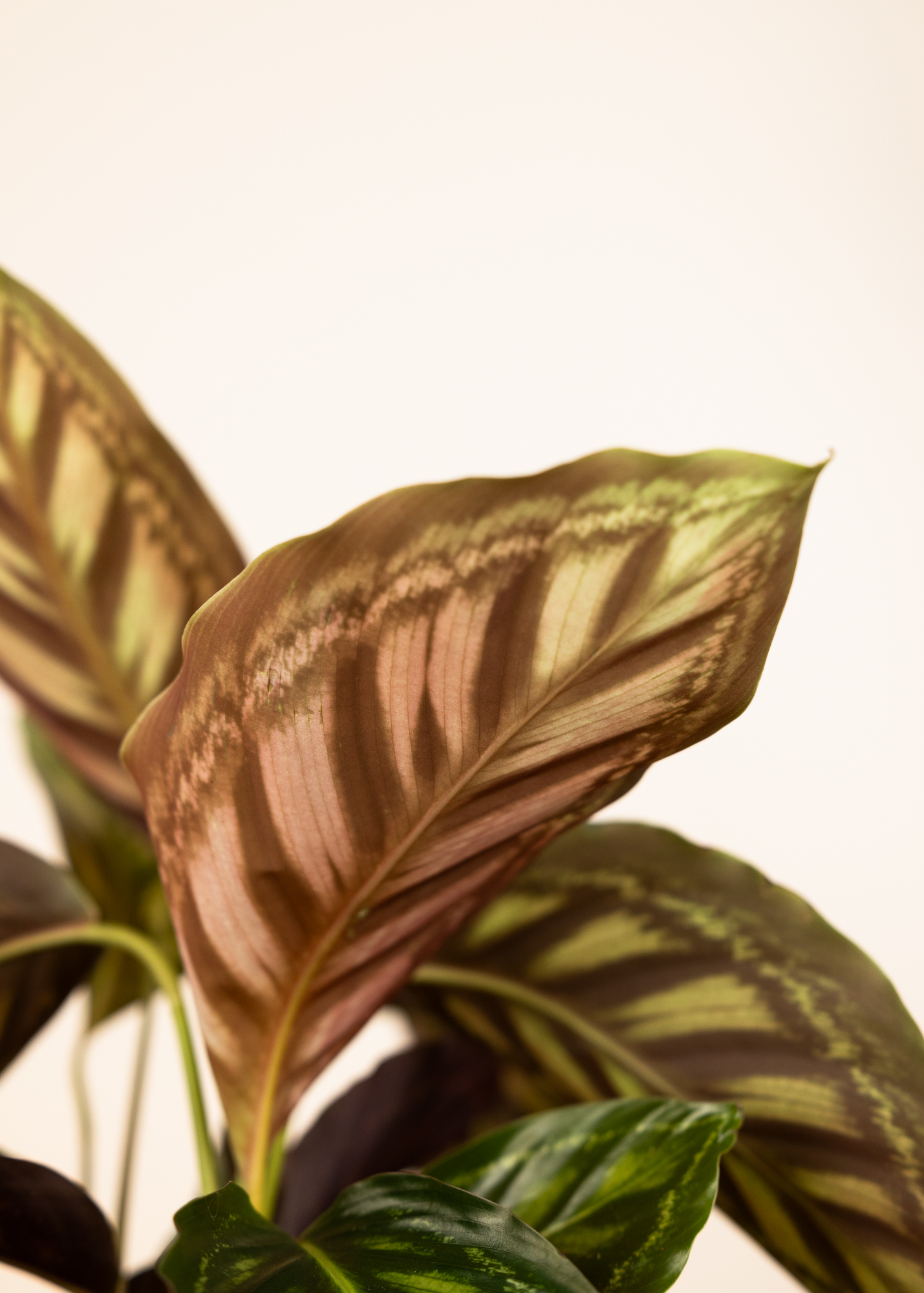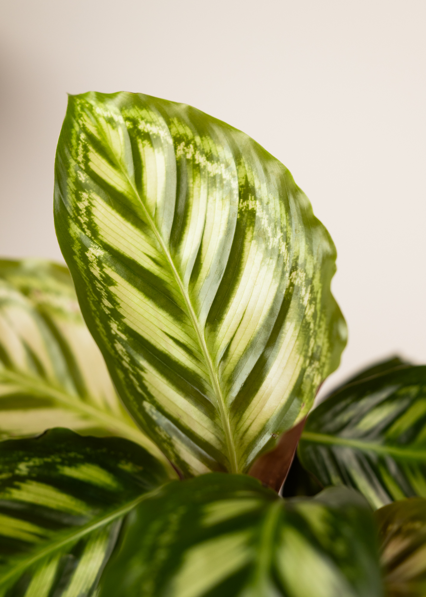 Typisch für Calatheas bewegt die Flamestar ihre Blätter im Tagesverlauf – abends richten sie sich auf, morgens öffnen sie sich wieder. Durch ihren buschigen, aufrechten Wuchs eignet sie sich perfekt für Wohnräume, Regale oder helle, indirekte Standorte, an denen sie als lebendiger Blickfang wirkt.
