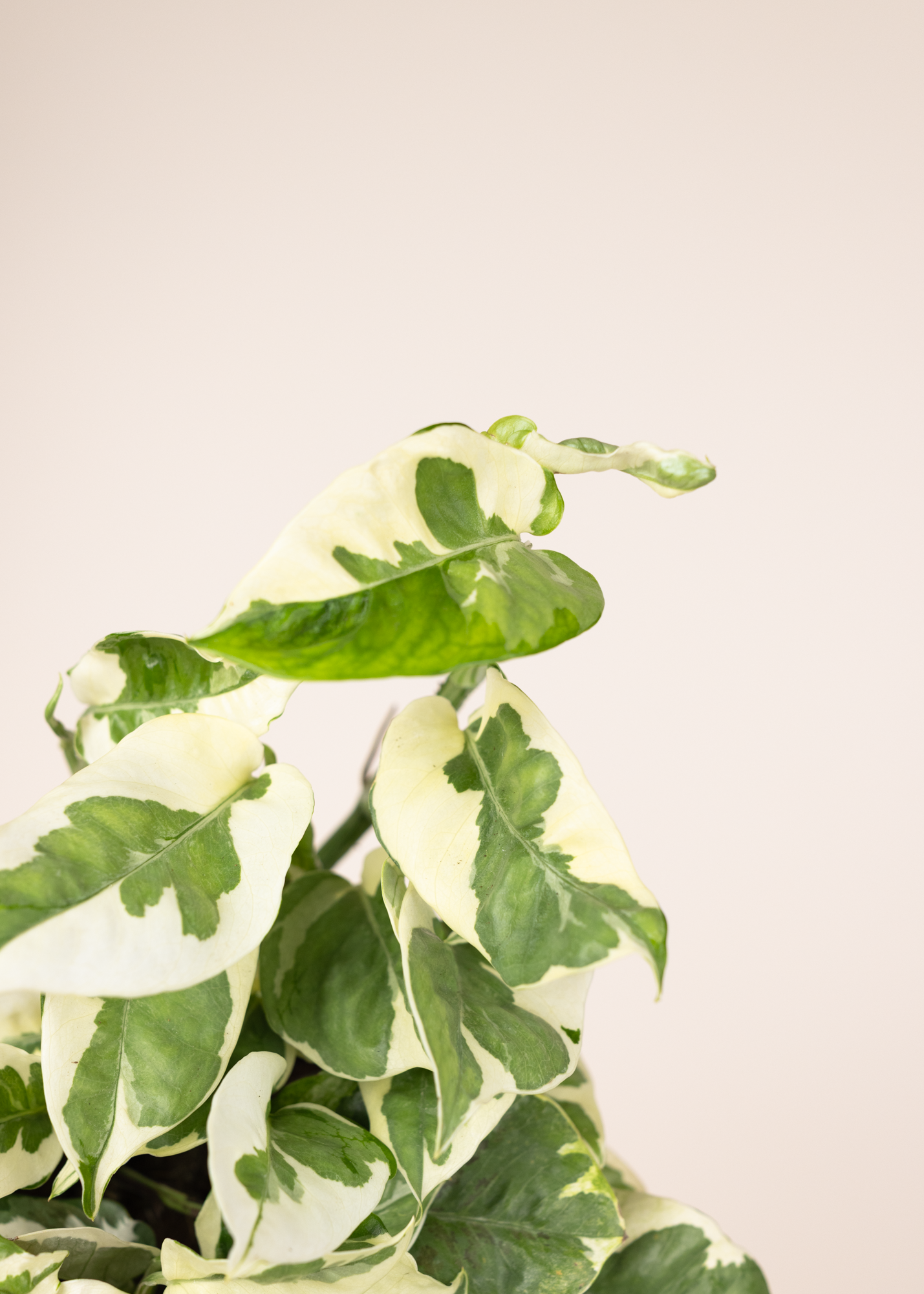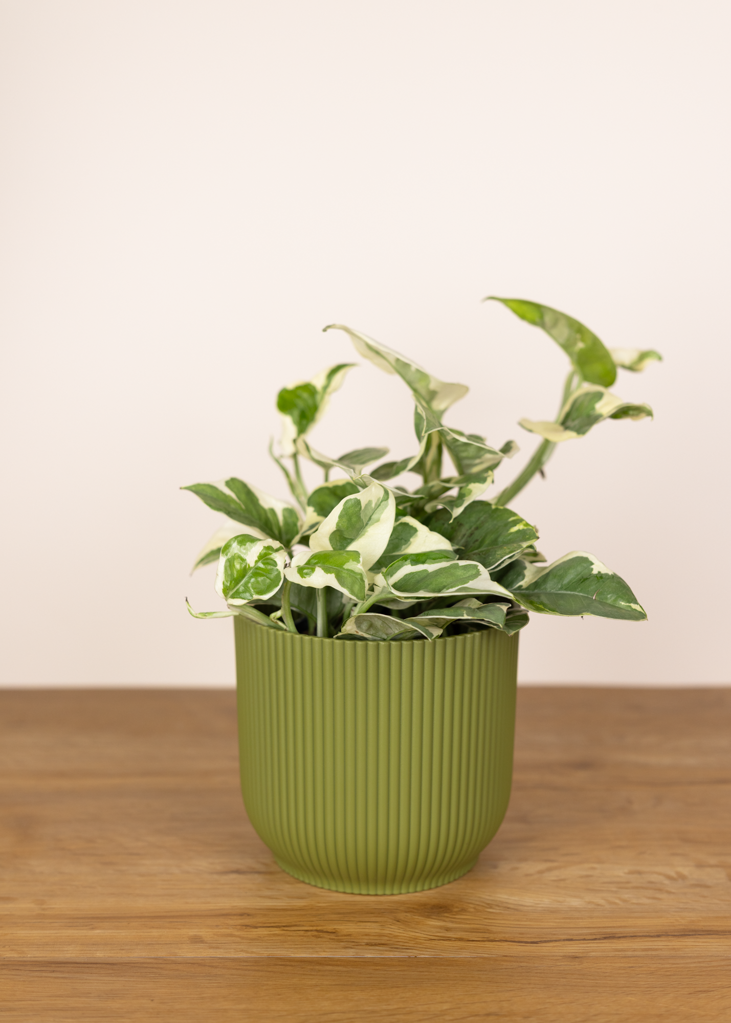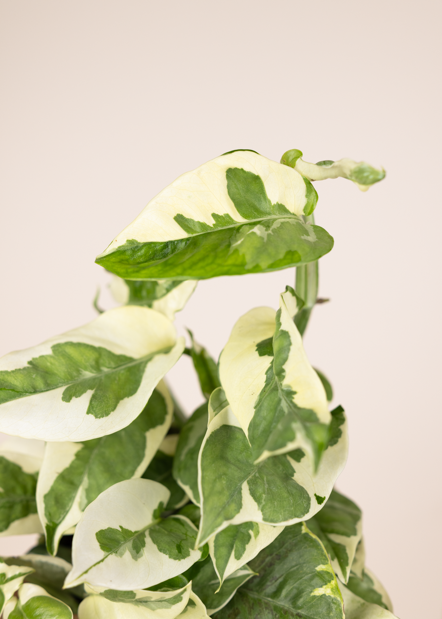 Epipremnum aureum ‘N’Joy’ ist eine besonders elegante und kompakte Variante der klassischen Efeutute. Ihre kleinen, leicht gewellten Blätter zeigen ein kontrastreiches Zusammenspiel aus sattem Grün und klar abgegrenzten, cremeweißen Bereichen.