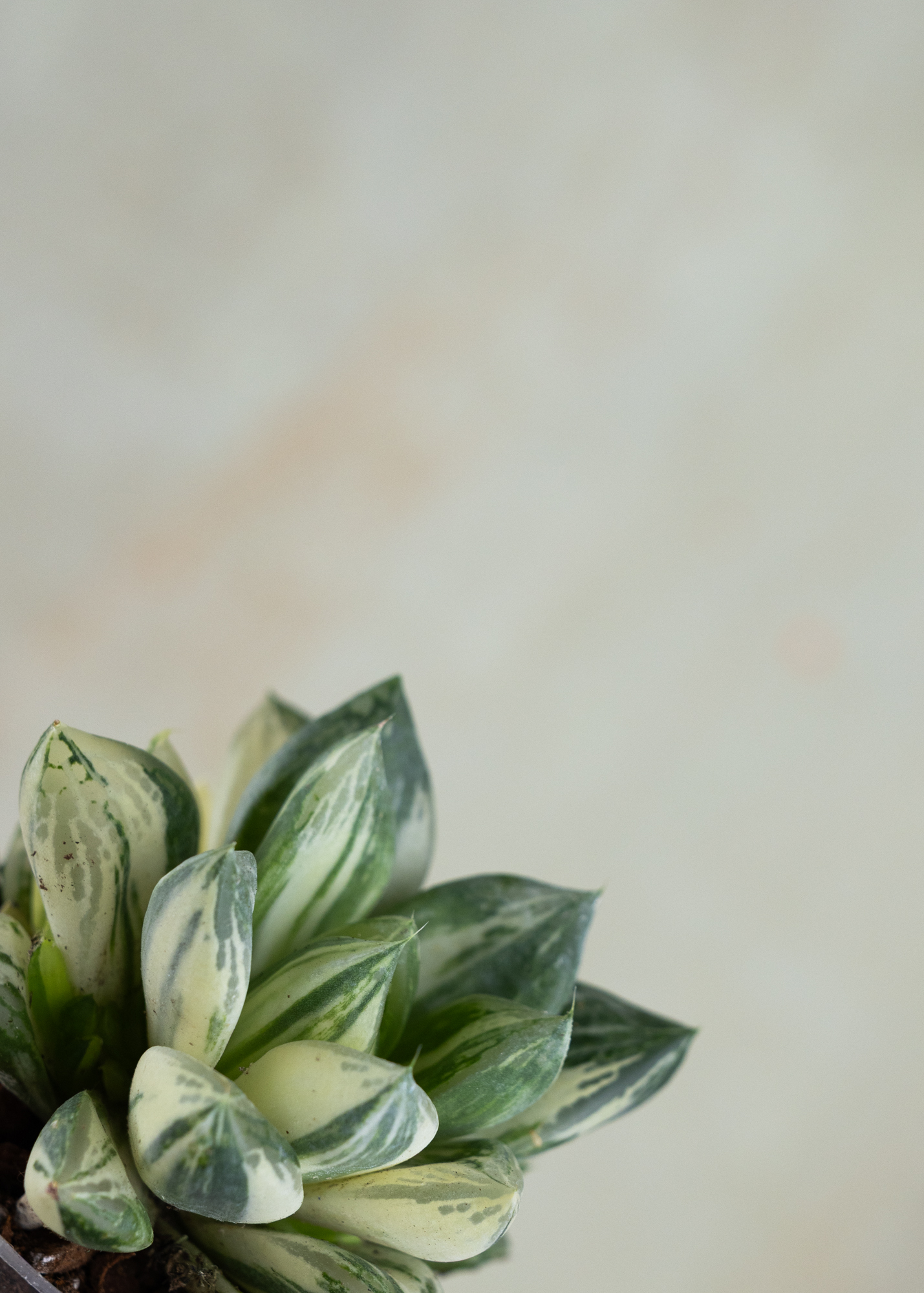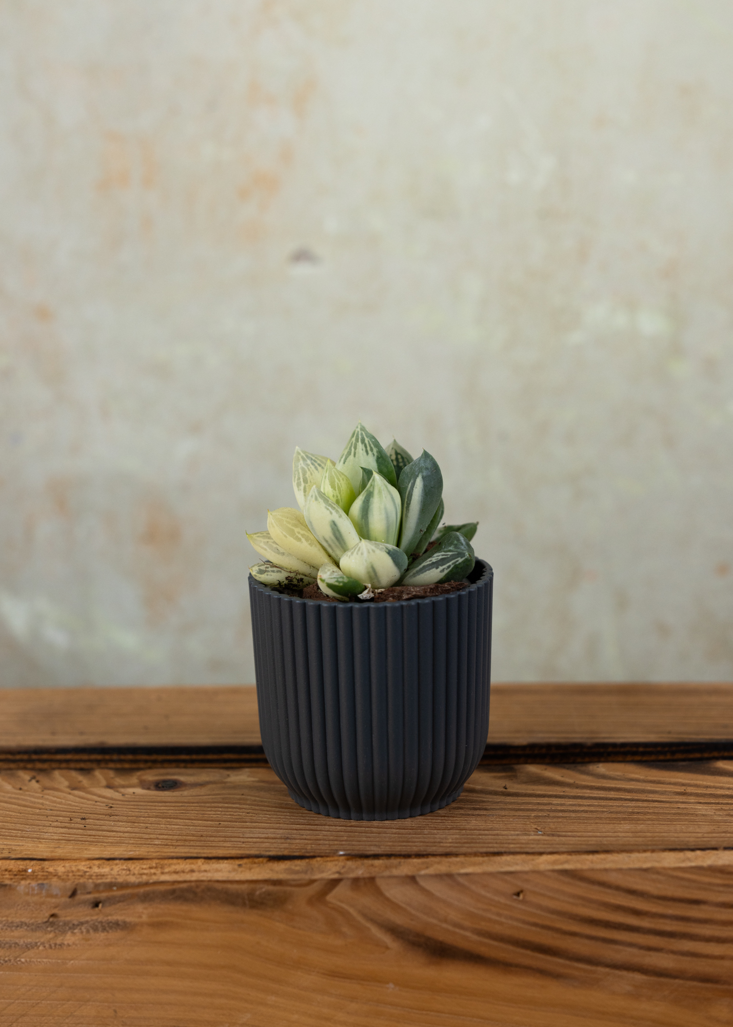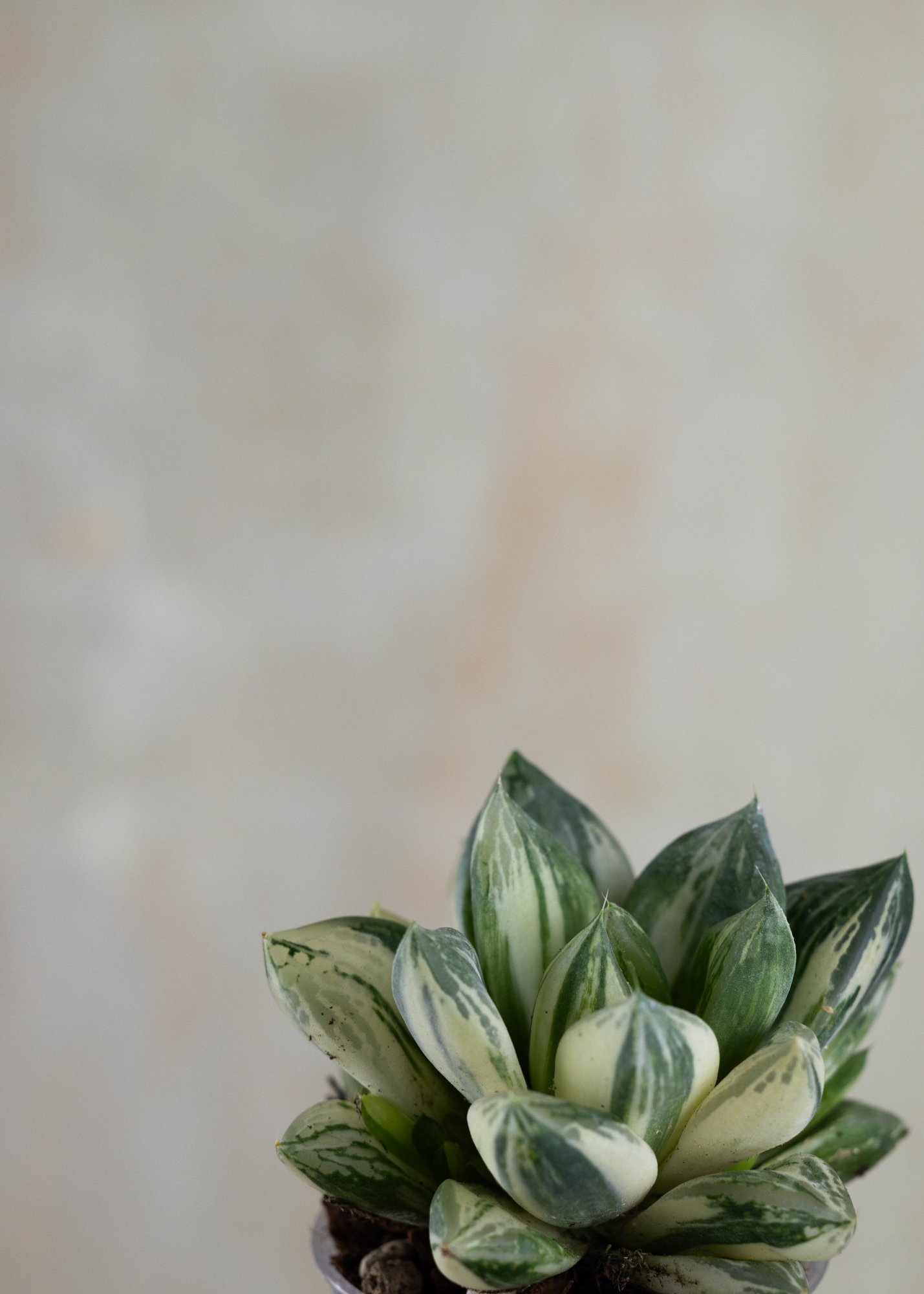 Die Haworthia variegata ist eine bezaubernde, kompakt wachsende Sukkulente mit einer wunderschönen, natürlichen Panaschierung. Ihre dickfleischigen, spitz zulaufenden Blätter zeigen ein faszinierendes Muster aus Grün, Creme und Weiß, das je nach Lichtintensität unterschiedlich schimmert. Durch ihre kompakte Rosettenform ist sie ideal für kleine Töpfe, Regale oder sonnige Fensterbänke.
