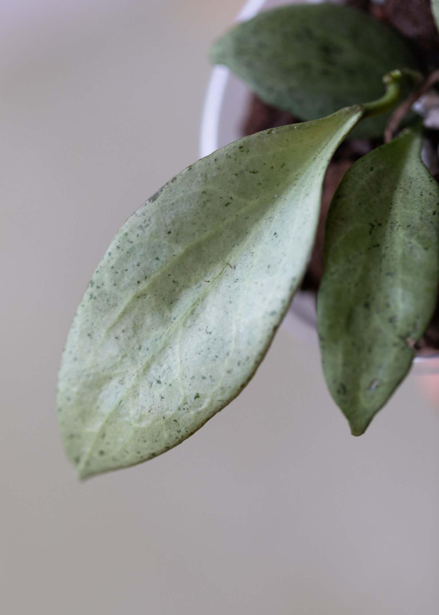 Diese außergewöhnliche Hoya begeistert mit ihren geisterhaft silbrig-grünen Blättern, die je nach Lichtverhältnissen fast schon schimmern! Die Hoya Nicholsoniae 'New Guinea Ghost' ist nicht nur eine echte Rarität, sondern auch eine unkomplizierte Kletter- oder Hängepflanze, die mit der richtigen Pflege wunderschöne, zarte Blüten hervorbringen kann.