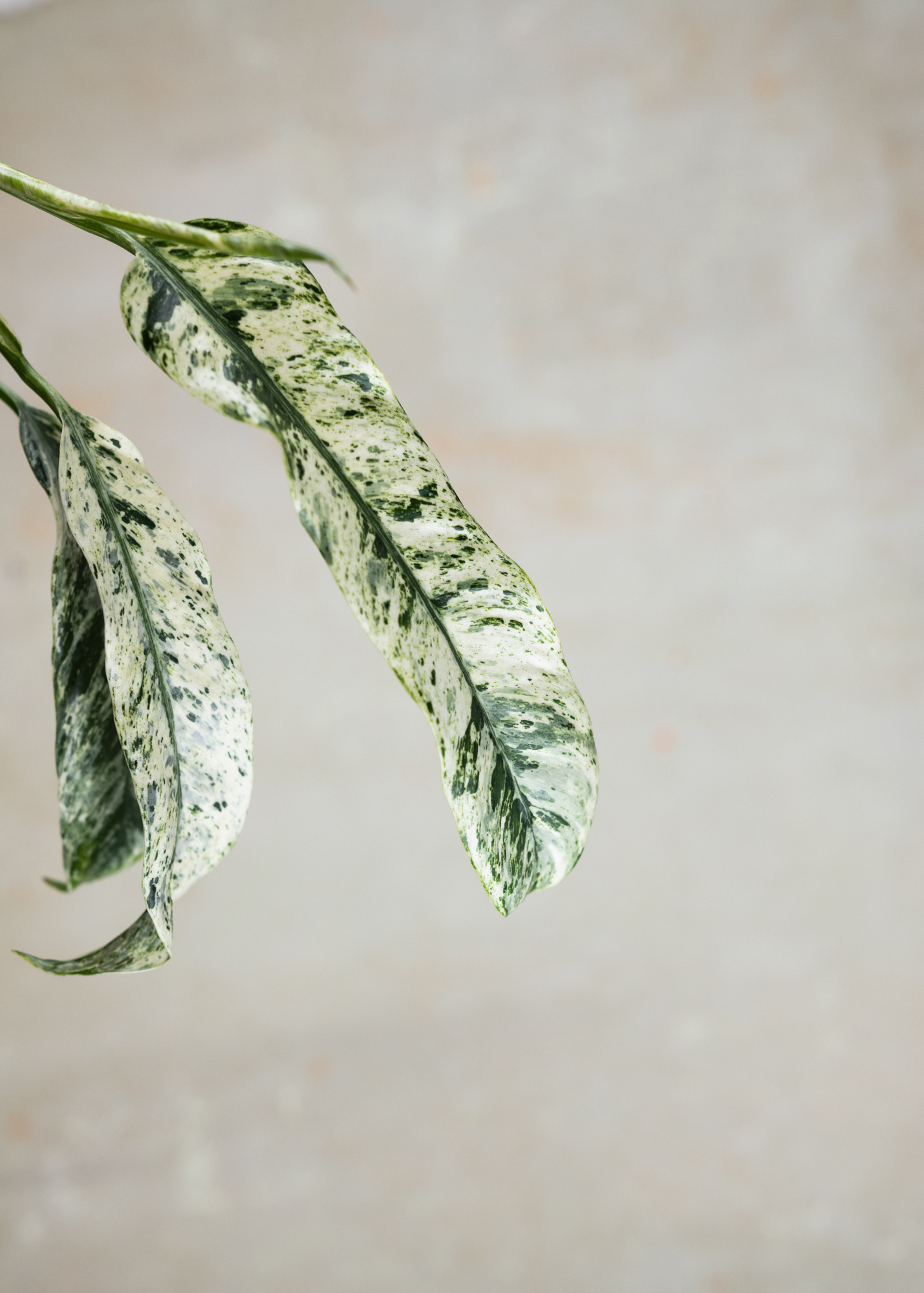 Die Rhaphidophora puberula variegata ist eine äußerst seltene Aroid-Rarität, die mit ihrer atemberaubenden Panaschierung sofort ins Auge fällt. Ihre glänzenden, länglich geformten Blätter zeigen ein faszinierendes Muster aus Grün, Creme und Weiß, das jede Pflanze zu einem echten Unikat macht. Mit ihrem tropisch-eleganten Wuchs erinnert sie an eine Mischung aus Monstera und Epipremnum – perfekt für Liebhaber*innen seltener, strukturbetonter Blattschmuckpflanzen.