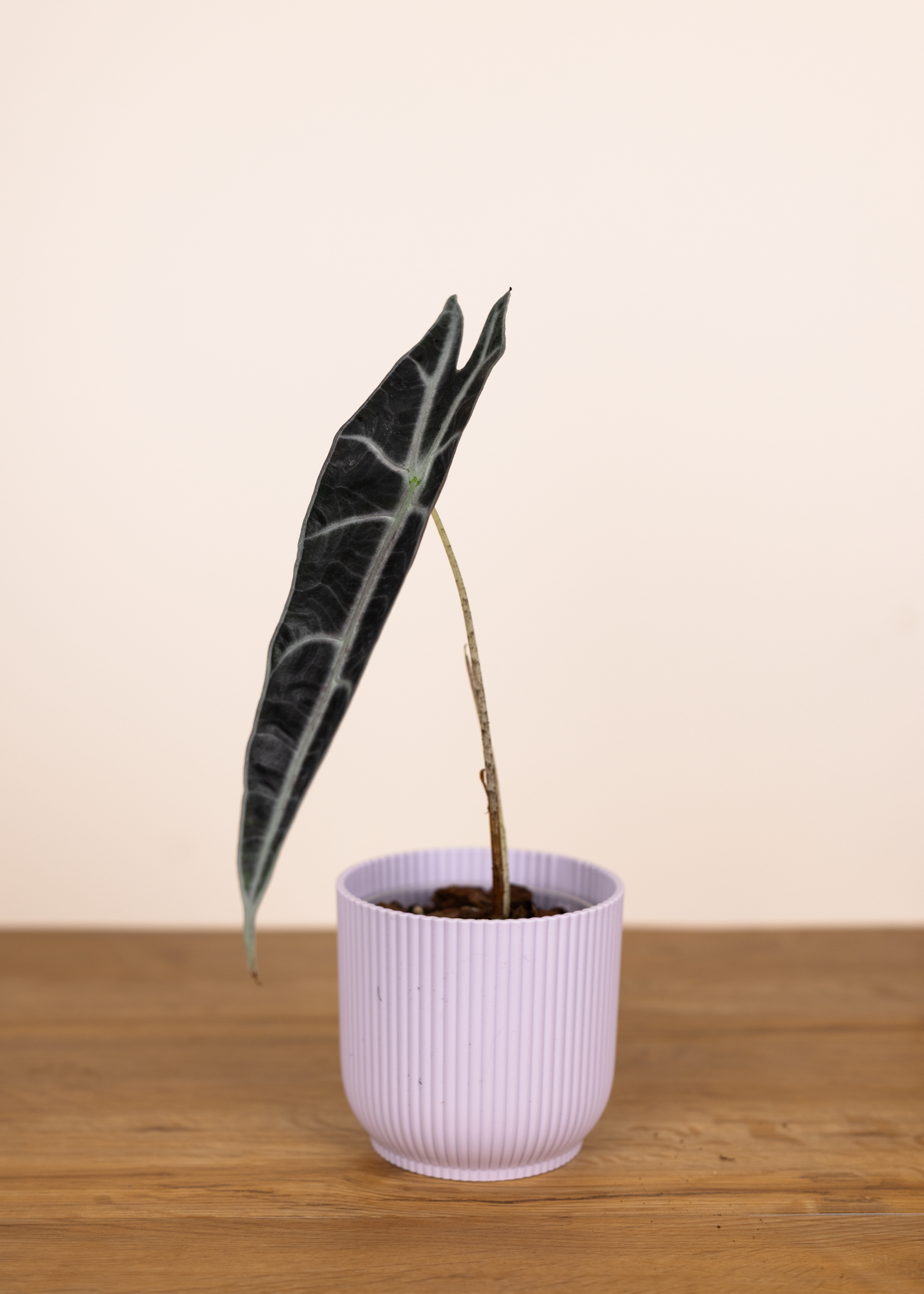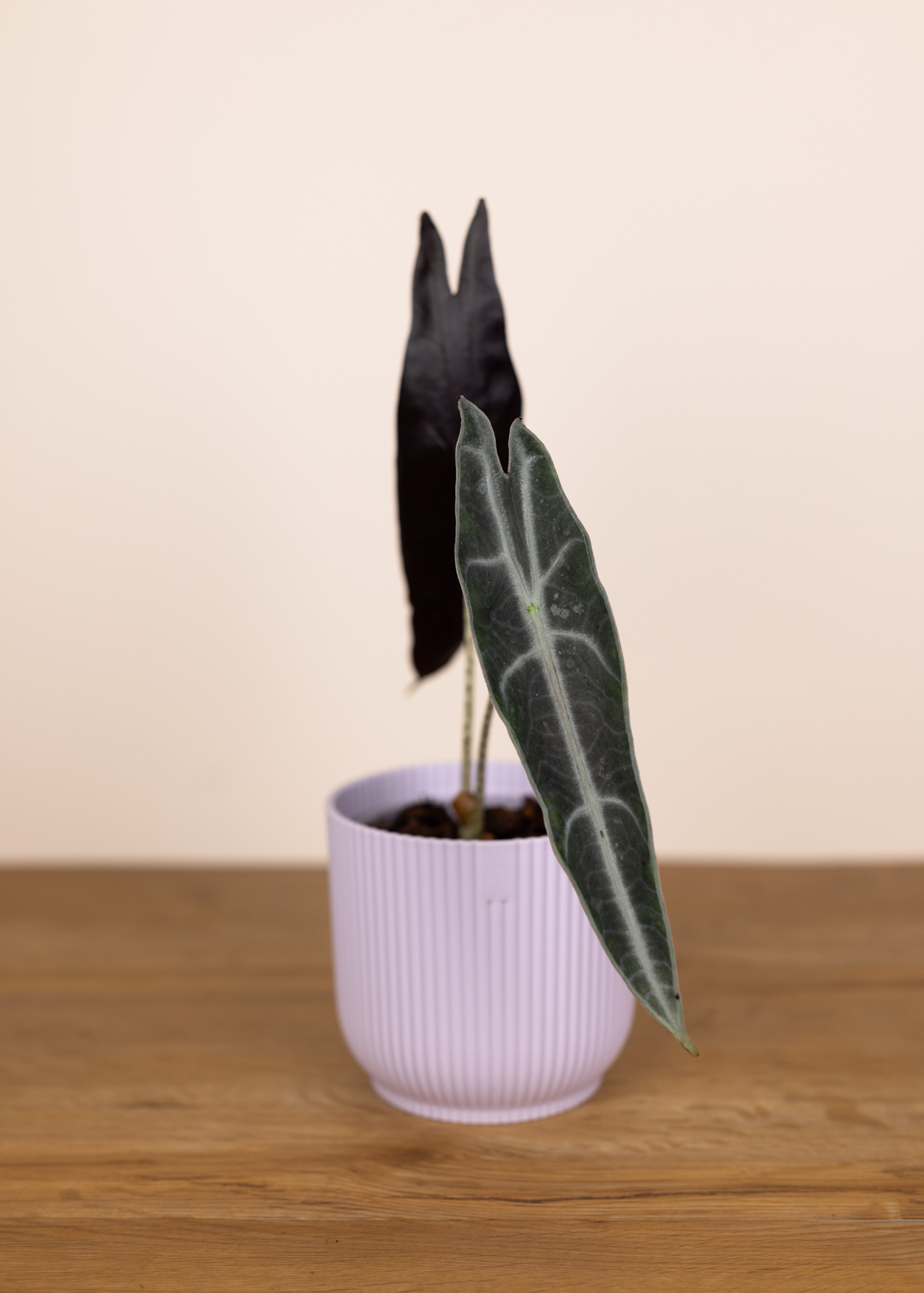 Die Alocasia longiloba ‘Purple’ ist eine elegante und zugleich ausdrucksstarke Alokasie mit besonderem Farbspiel. Ihre schmalen, pfeilförmigen Blätter zeigen ein tiefes Grün mit markanter Aderung, während die Blattunterseiten in einem intensiven Violett- bis Purpurton leuchten.