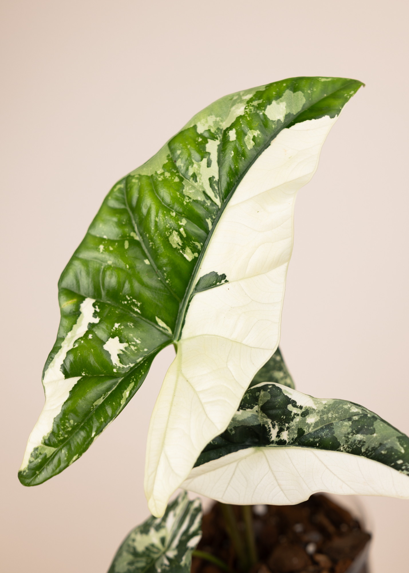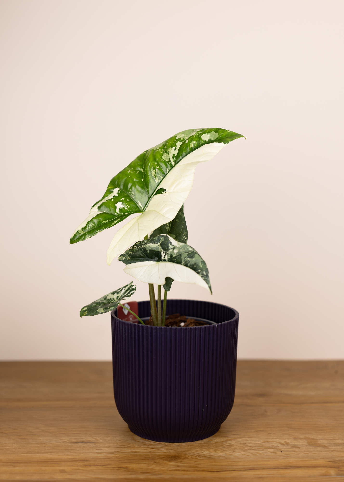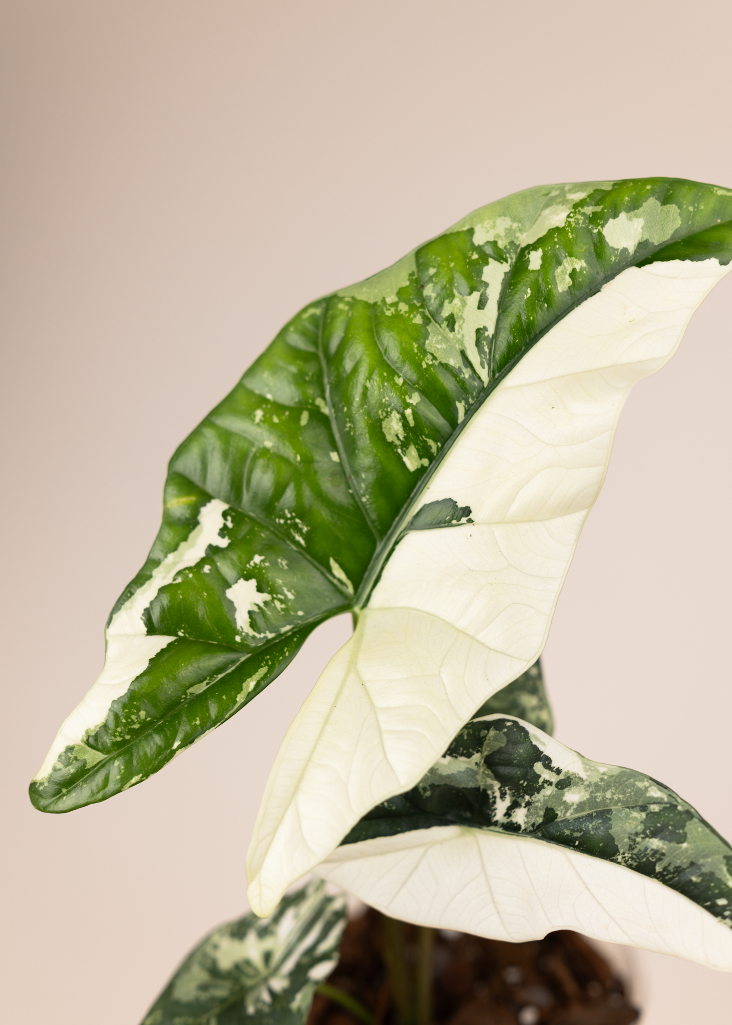 Die Alocasia simpo albo variegata ist eine seltene und besonders elegante Alokasie mit auffälliger, weißer Panaschierung. Ihre pfeilförmigen Blätter zeigen ein intensives Grün, das von unregelmäßigen cremeweißen bis reinweißen Variegationen durchzogen wird – jedes Blatt ein einzigartiges Kunstwerk.