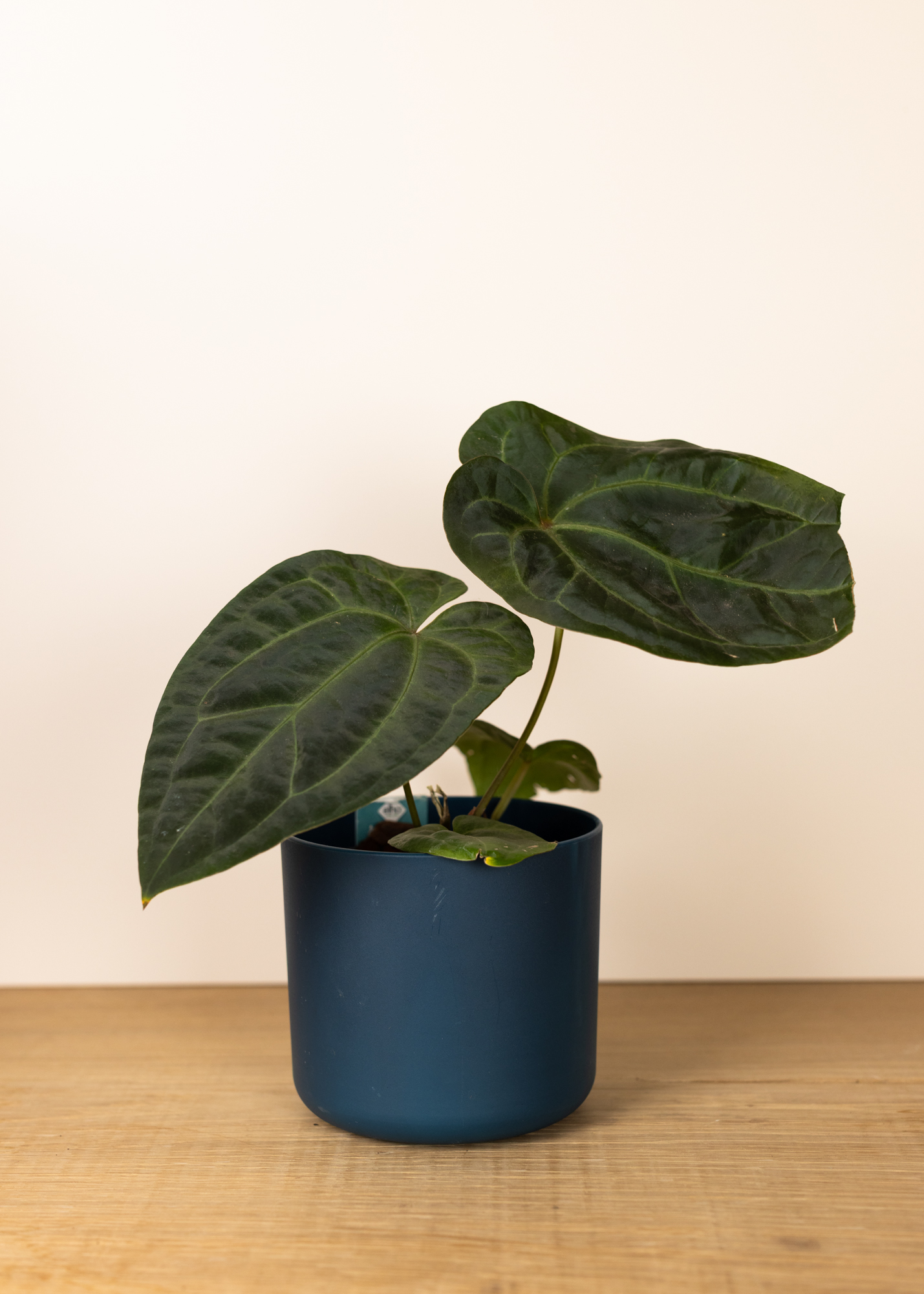 Dieses Anthurium NoID besticht durch seine dunklen, herzförmigen Blätter mit samtiger Oberfläche und hervortretenden, helleren Blattadern. Der Kontrast zwischen dem fast schwarzen Grün und den prominenten Venen verleiht der Pflanze eine dramatische, luxuriöse Ausstrahlung – ein echter Blickfang für alle, die Blattschmuckpflanzen mit Charakter lieben.