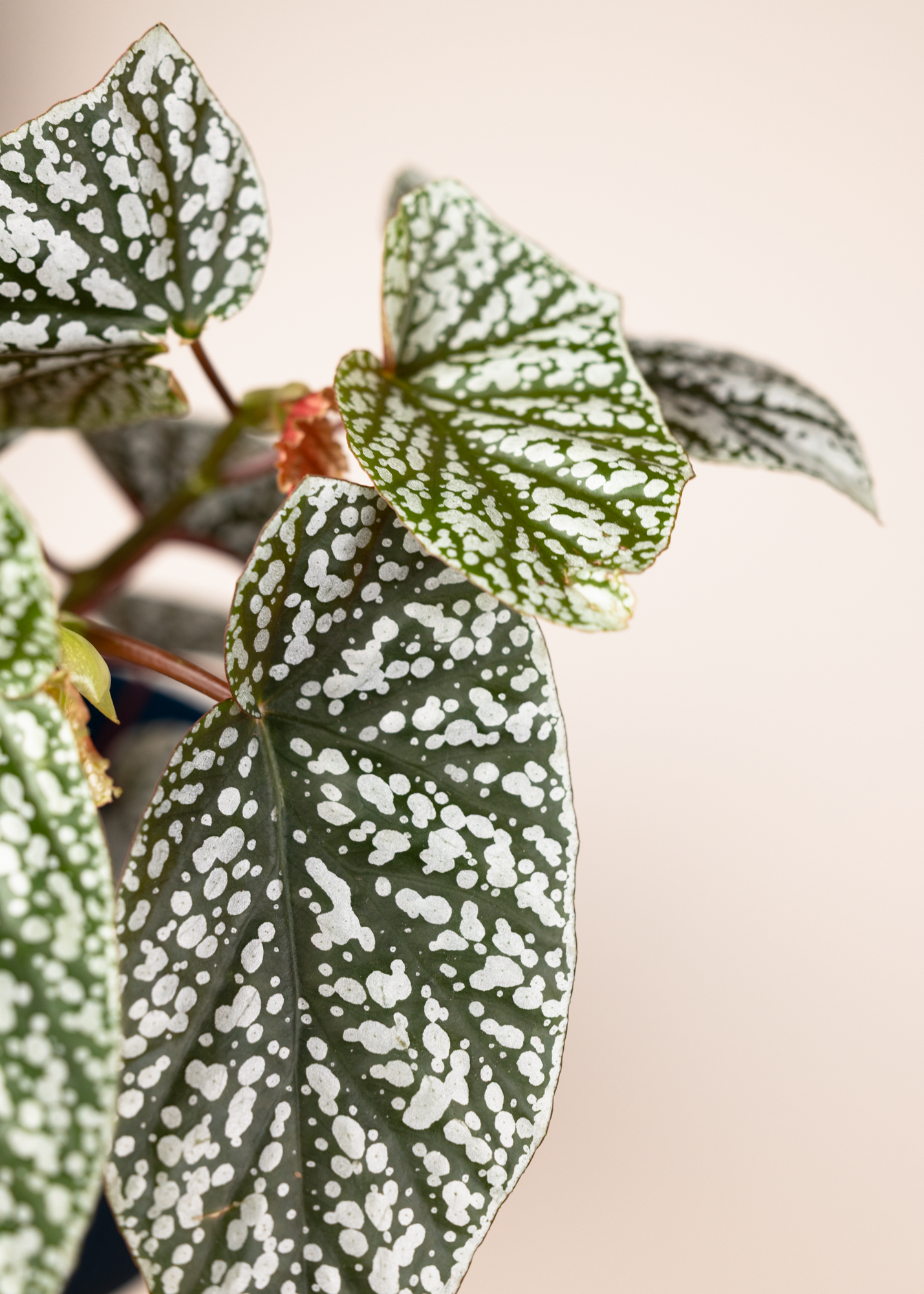 Die Begonia ‘Snowcap’ ist eine elegante Blattschönheit mit außergewöhnlicher Zeichnung. Ihre dunklen, oft tiefgrünen bis leicht rötlichen Blätter sind mit feinen, hellen Sprenkeln überzogen – als wären sie von einem zarten Schneeschleier bedeckt. Dieser Kontrast verleiht der Pflanze eine ruhige, gleichzeitig spannende Ausstrahlung.