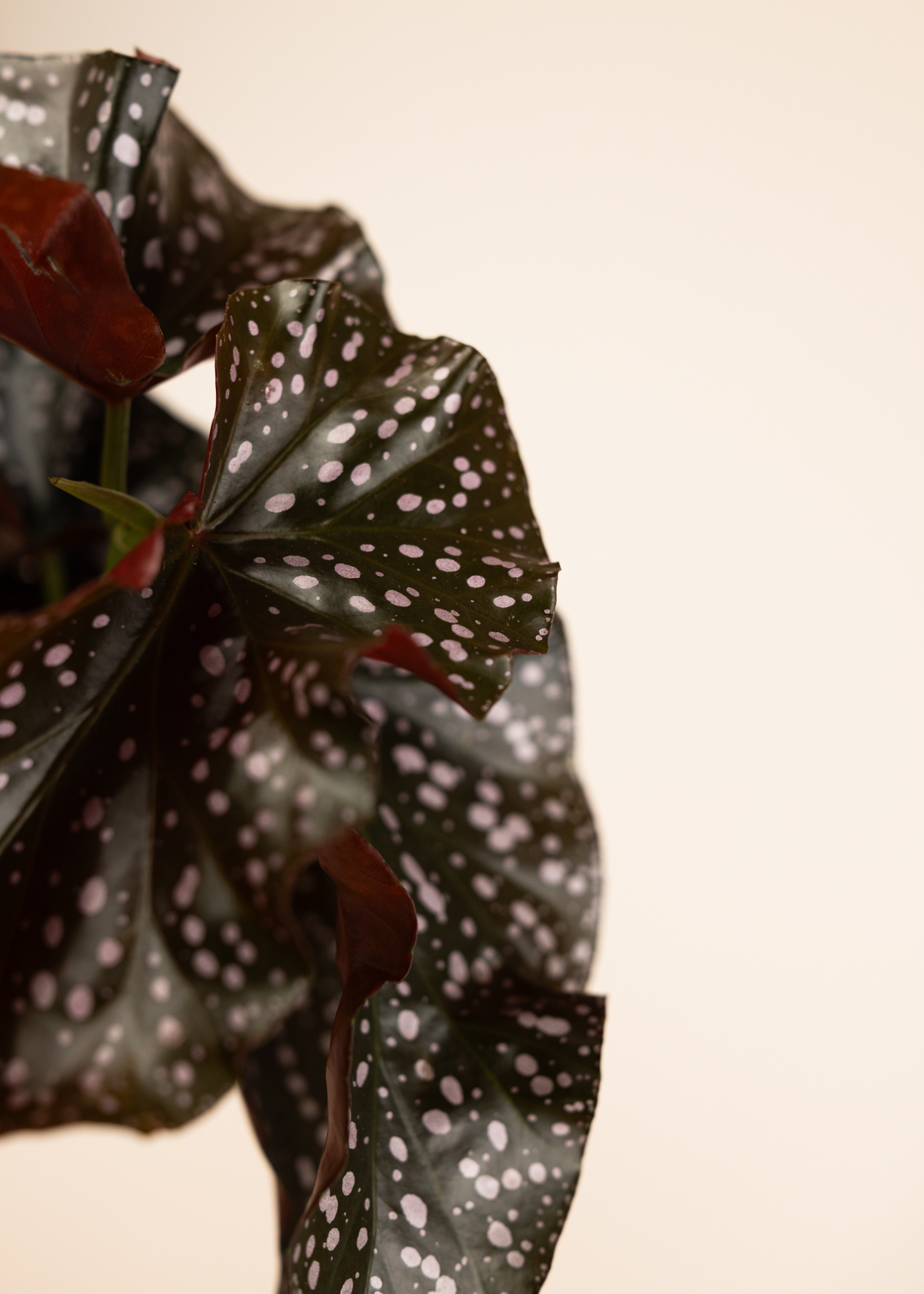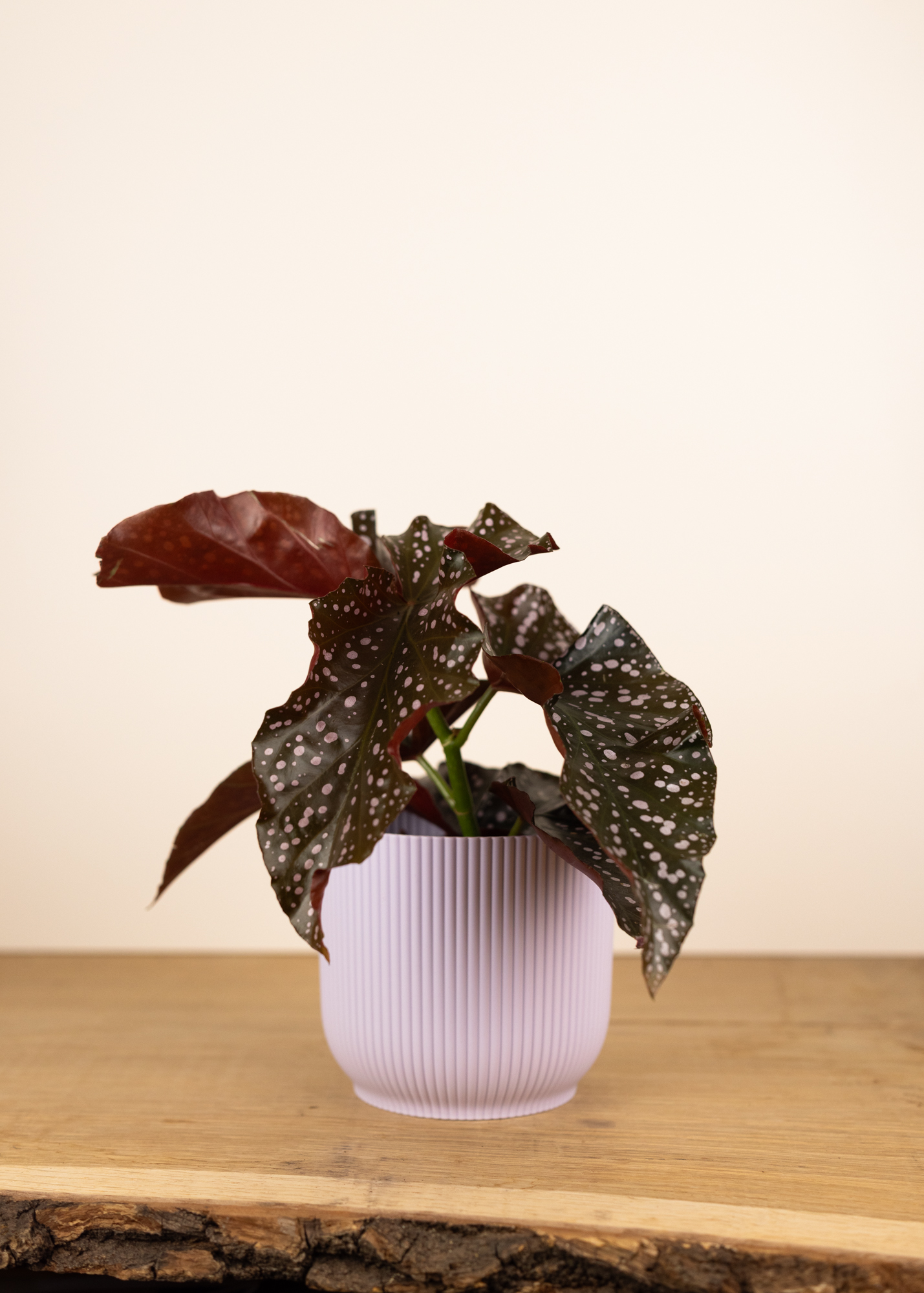 Die Begonia ‘Cracklin’ Rose’ ist eine außergewöhnliche Blattschmuckbegonie mit stark strukturierten, spiralig gewellten Blättern, die sofort ins Auge fallen. Die Oberfläche zeigt ein intensives Farbspiel aus Rosa, Silber und Dunkelgrün.