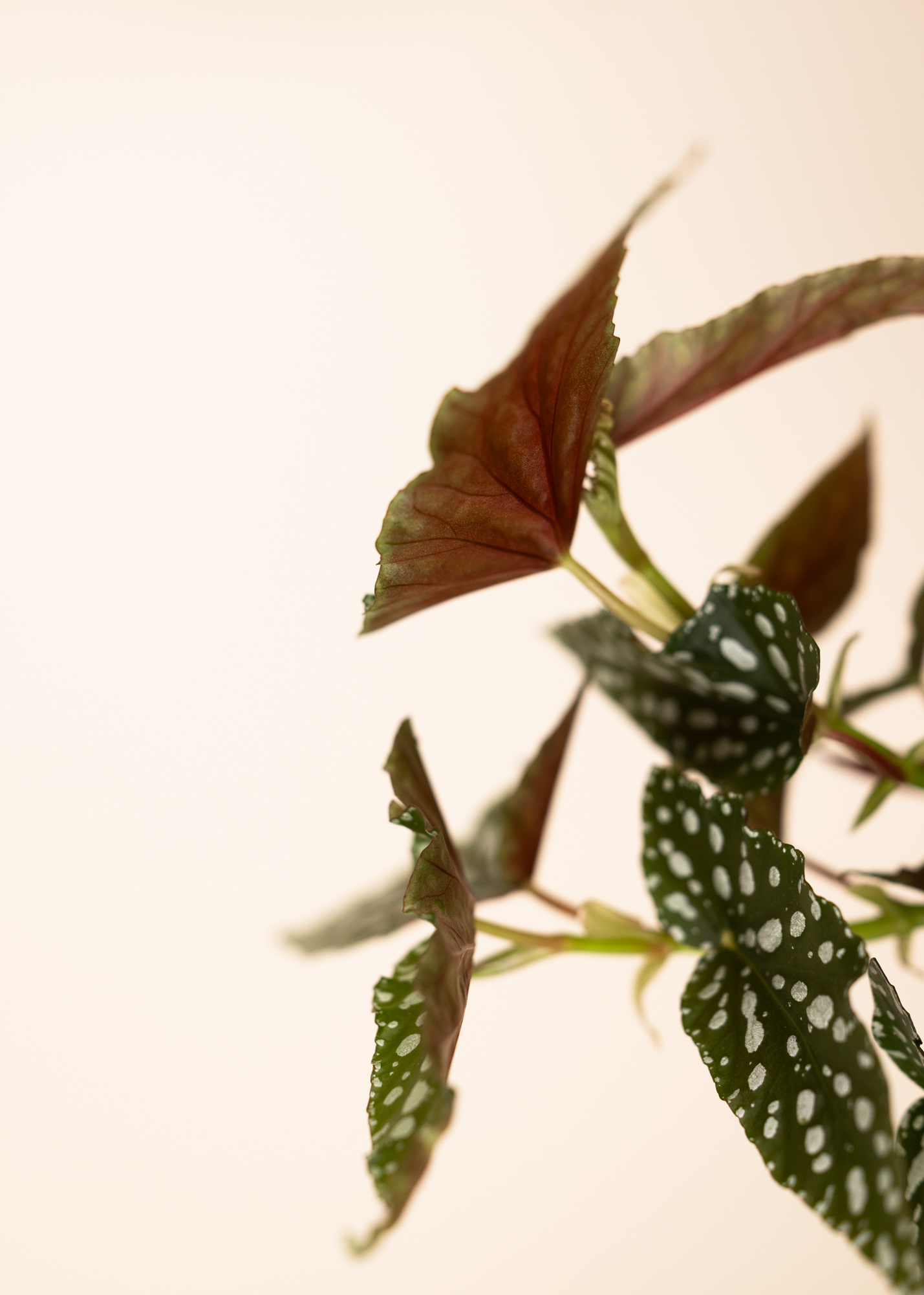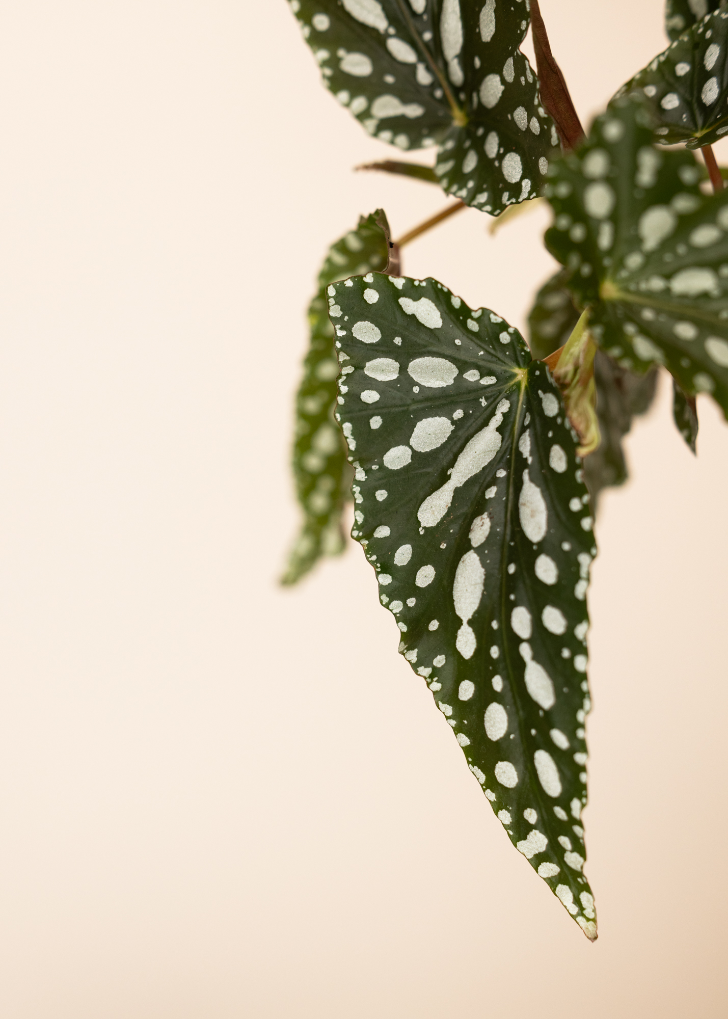Diese Begonia Hybrid erinnert optisch an die klassische Forellenbegonie (Begonia maculata), ohne eindeutig dieser Art zugeordnet zu sein. Die länglich geformten, olivgrünen Blätter zeigen eine helle, punktartige Zeichnung, die an die typische Tupfung der Maculata erinnert. Je nach Exemplar können Form, Punktgröße und Blattfarbe leicht variieren – ein Zeichen ihres hybriden Ursprungs.