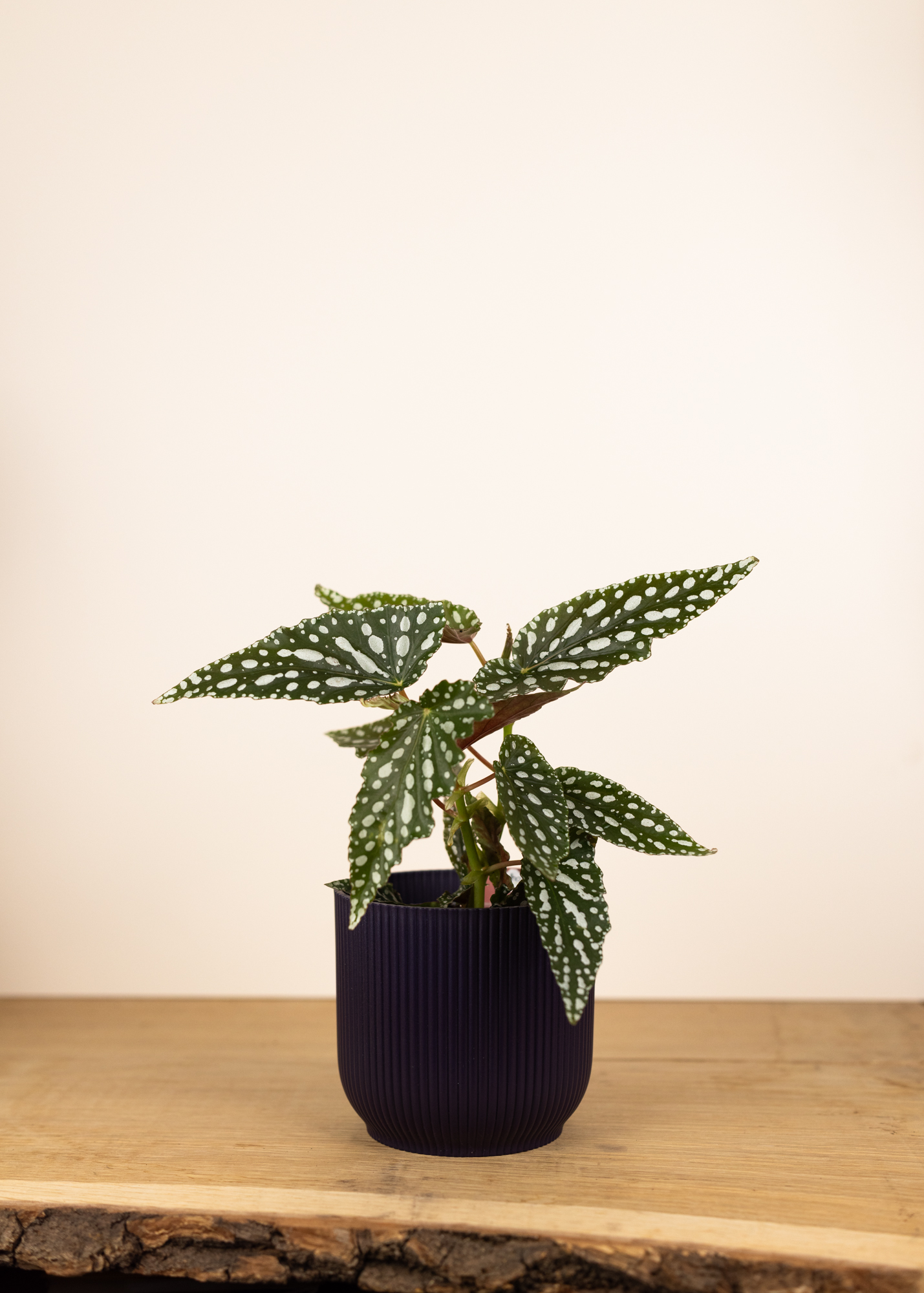 Die rote bis rötlich-violette Blattunterseite sorgt für einen starken Kontrast und macht die Pflanze auch von der Seite zu einem echten Hingucker. Mit ihrem aufrechten, leicht überhängenden Wuchs eignet sich diese Begonie hervorragend für Sideboards, Pflanzenständer oder helle Fensterplätze.