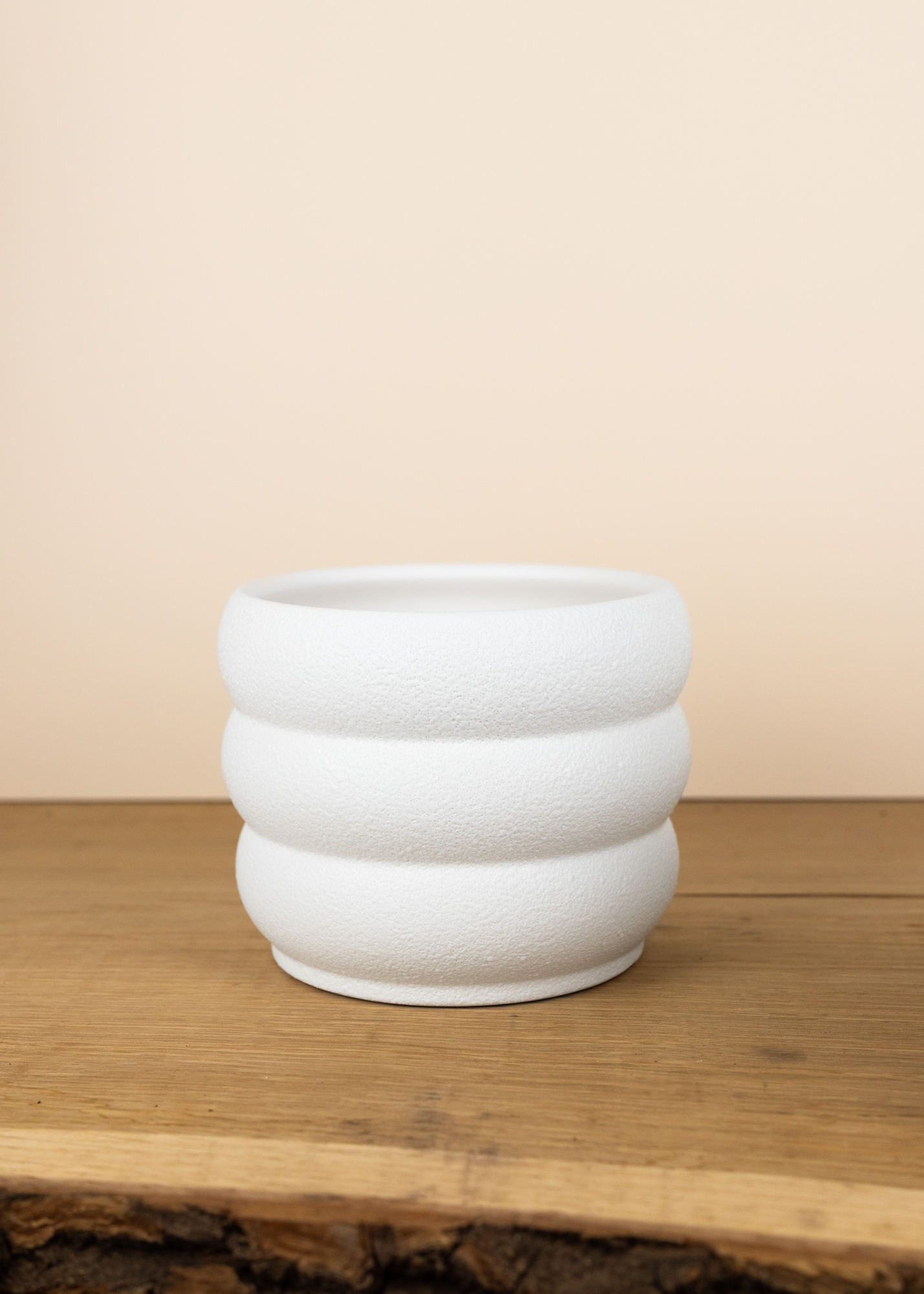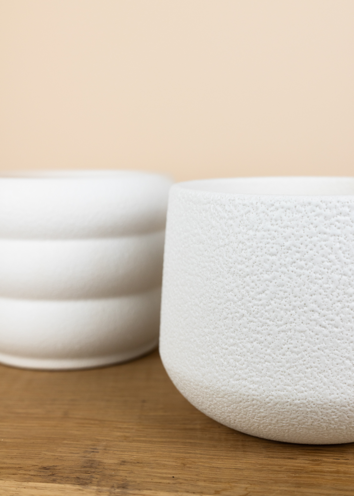 Das dezente Oberflächendetail verleiht dem Übertopf Tiefe und Charakter, ohne aufdringlich zu wirken. Gefertigt aus hochwertiger Keramik, ist er vollständig wasserdicht und ideal für den Einsatz im Innenbereich geeignet. Pflanzen kommen darin besonders ruhig, modern und natürlich zur Geltung.