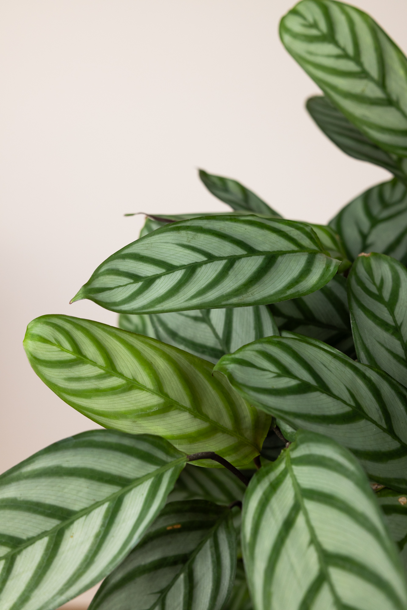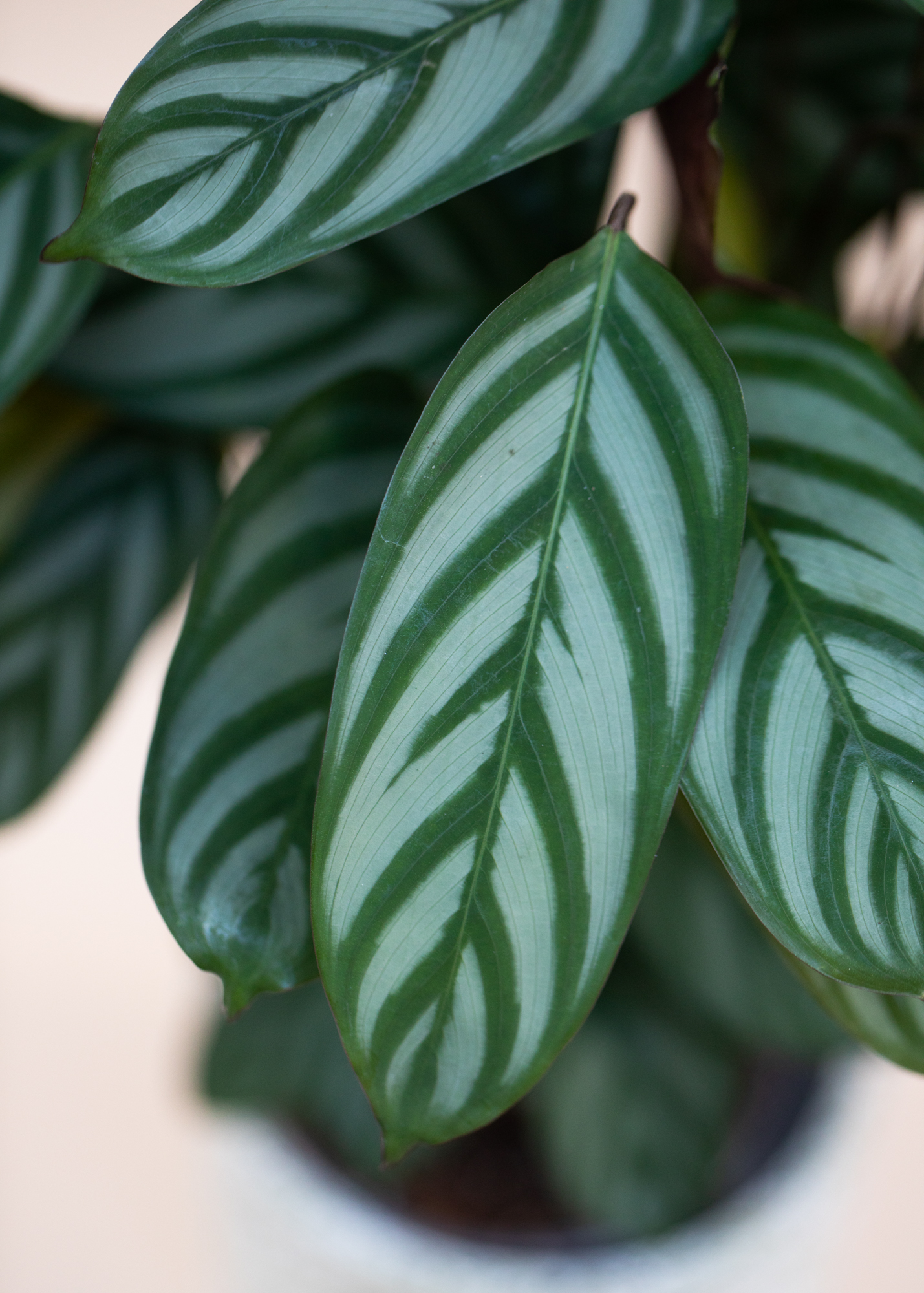 Typisch für Ctenanthe bewegen sich die Blätter je nach Tageszeit leicht – abends richten sie sich auf, morgens öffnen sie sich wieder. Durch ihren ausladenden, gleichzeitig weichen Wuchs eignet sie sich ideal für Wohnräume, Schlafzimmer oder ruhige Ecken, in denen sie eine entspannte, tropische Atmosphäre schafft.