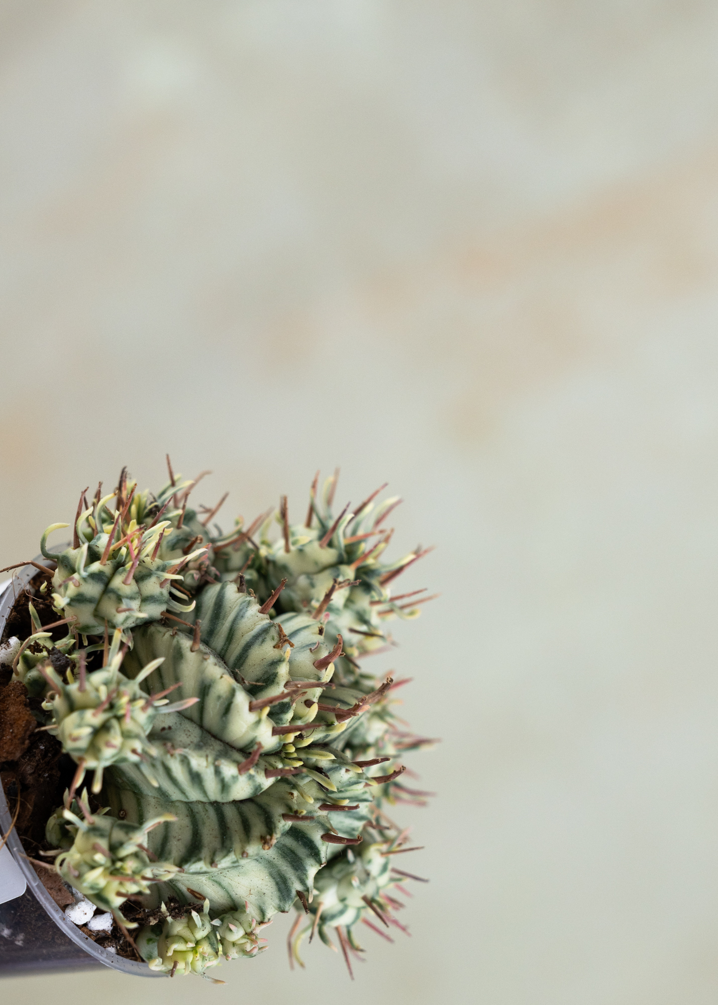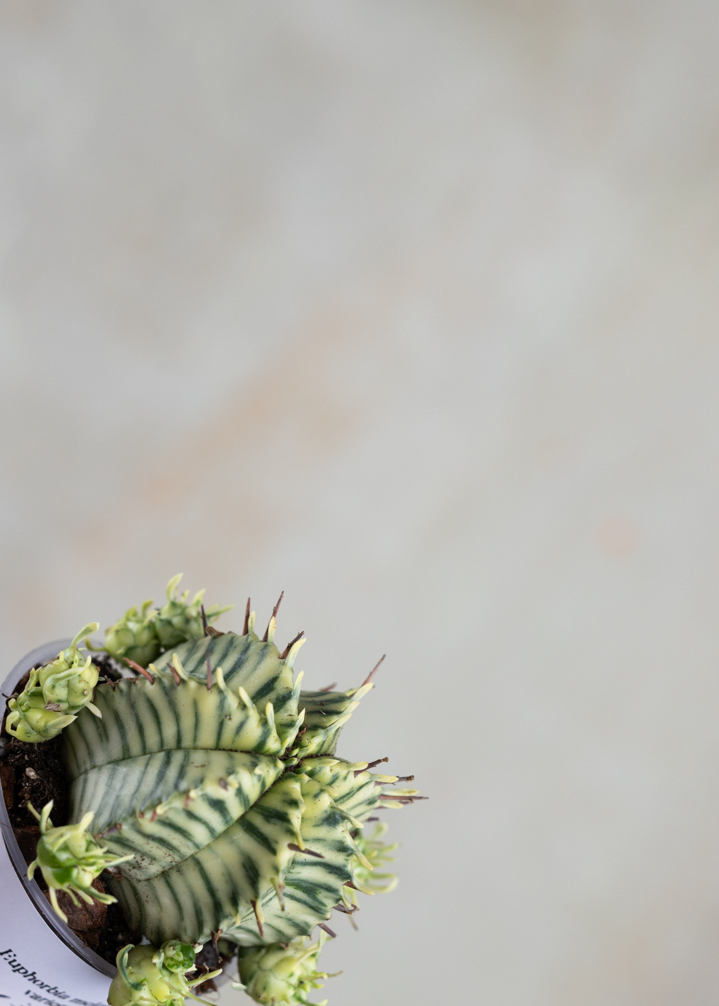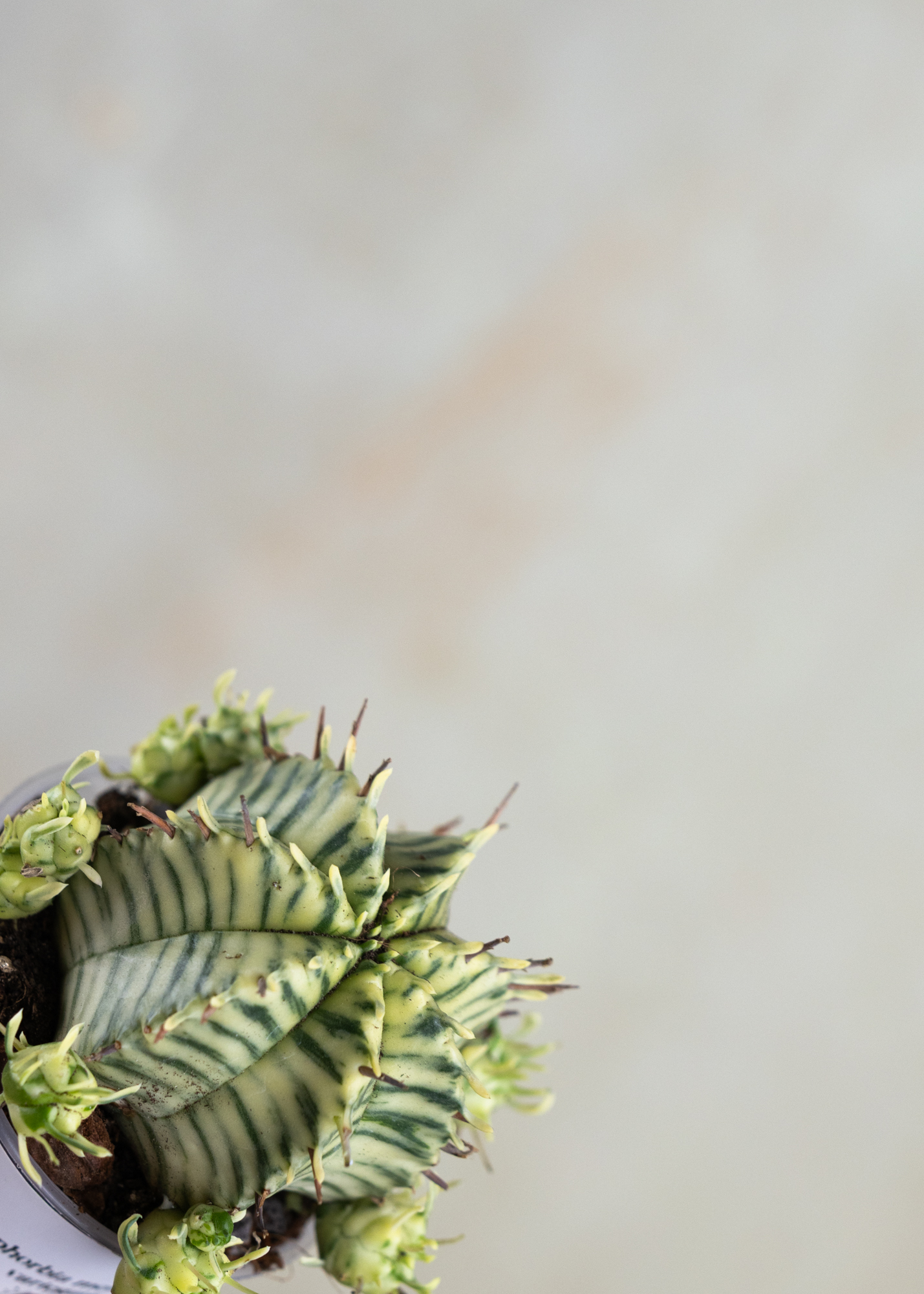 Diese Euphorbia wächst langsam, bleibt relativ klein und eignet sich perfekt für sonnige Fensterbänke oder Sukkulentensammlungen. Sie liebt helle bis vollsonnige Standorte und benötigt nur sehr wenig Wasser – Staunässe sollte unbedingt vermieden werden. Mit ihrem klaren, geometrischen Wuchs bringt sie ein modernes, minimalistisches Flair in dein Zuhause.