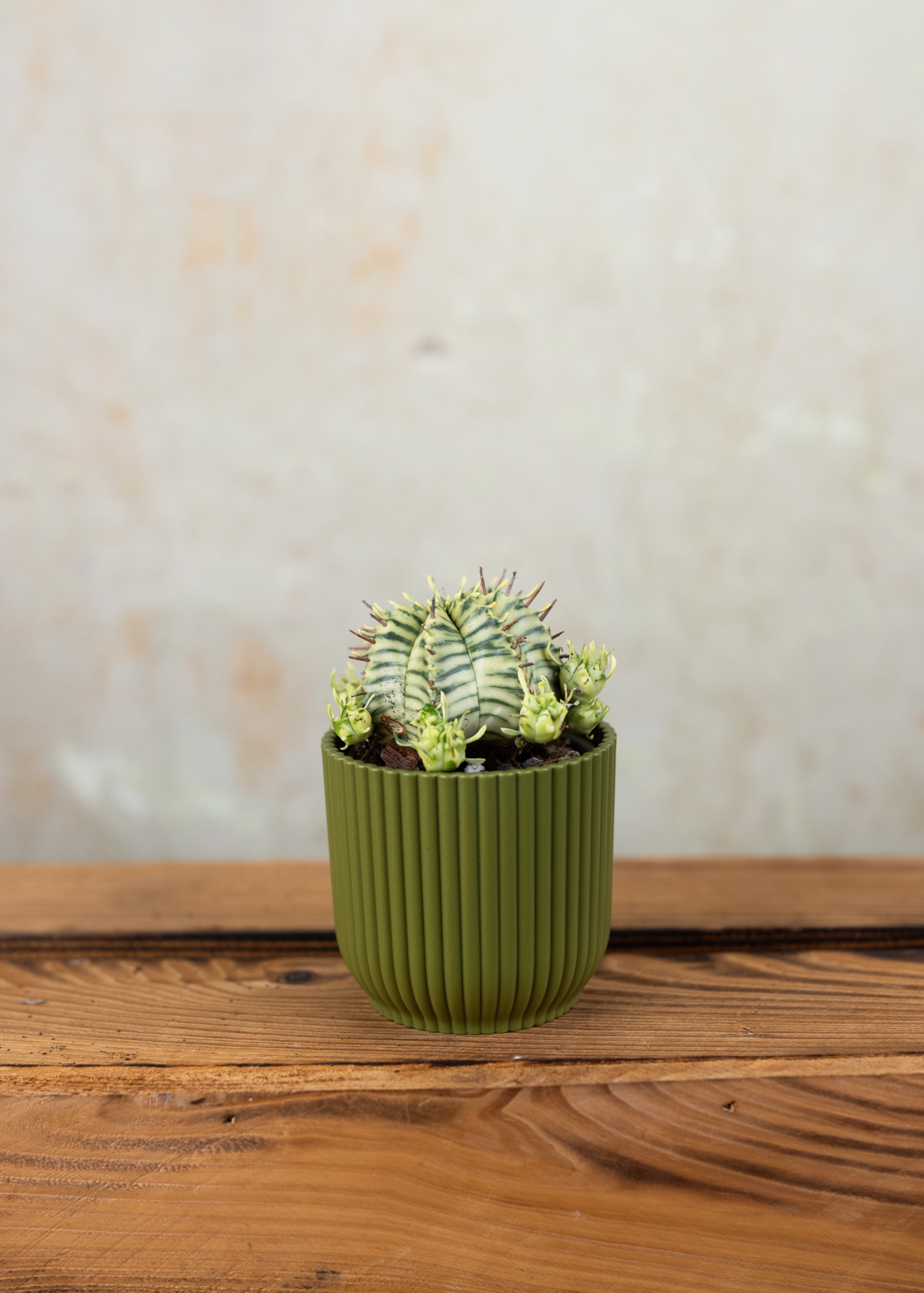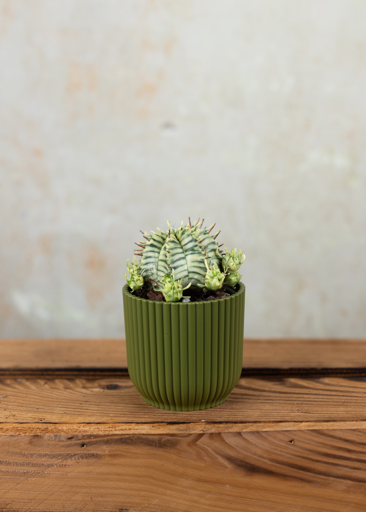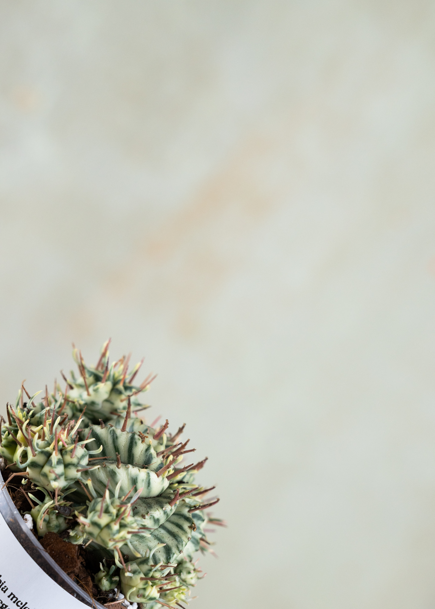 Diese Euphorbia wächst langsam, bleibt relativ klein und eignet sich perfekt für sonnige Fensterbänke oder Sukkulentensammlungen. Sie liebt helle bis vollsonnige Standorte und benötigt nur sehr wenig Wasser – Staunässe sollte unbedingt vermieden werden. Mit ihrem klaren, geometrischen Wuchs bringt sie ein modernes, minimalistisches Flair in dein Zuhause.