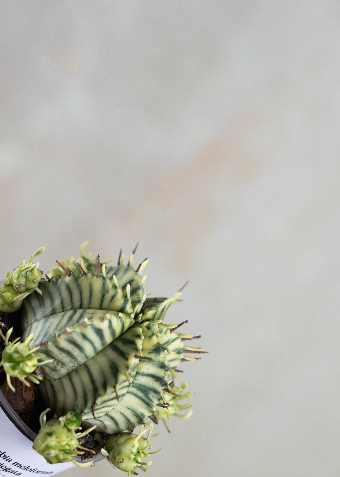 Die Euphorbia meloformis variegata ist eine außergewöhnliche, kompakte Sukkulente, die durch ihre markante Form und wunderschöne Panaschierung besticht. Ihr kugeliger bis leicht zylindrischer Körper erinnert an eine kleine Melone und zeigt ein Farbspiel aus Grün, Creme und Gelb, das sie zu einer echten Sammler-Rarität macht.