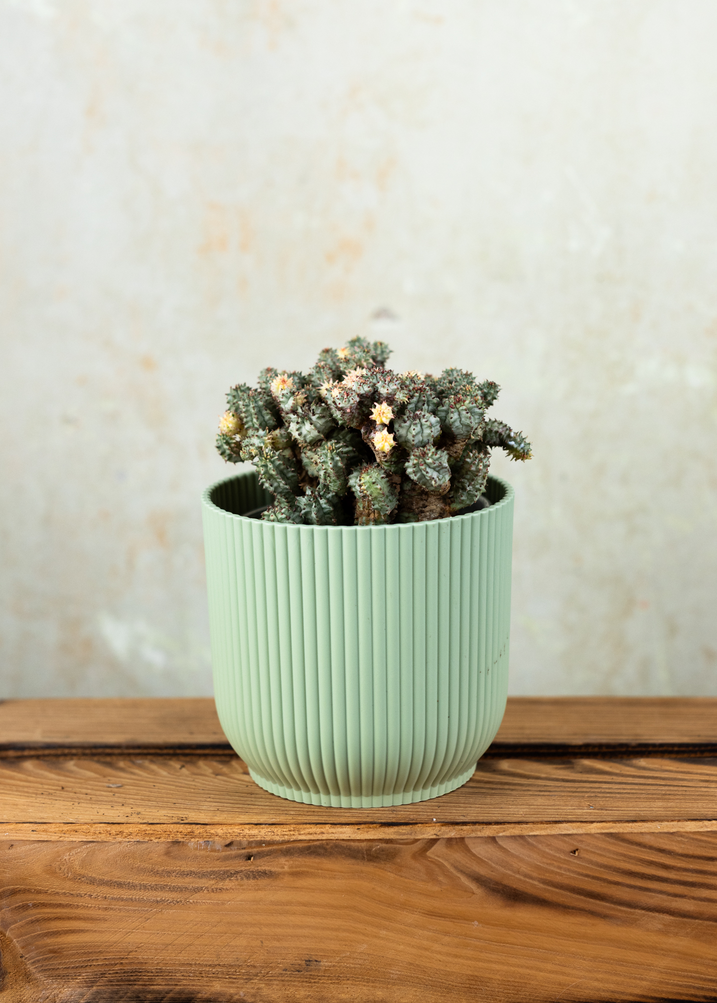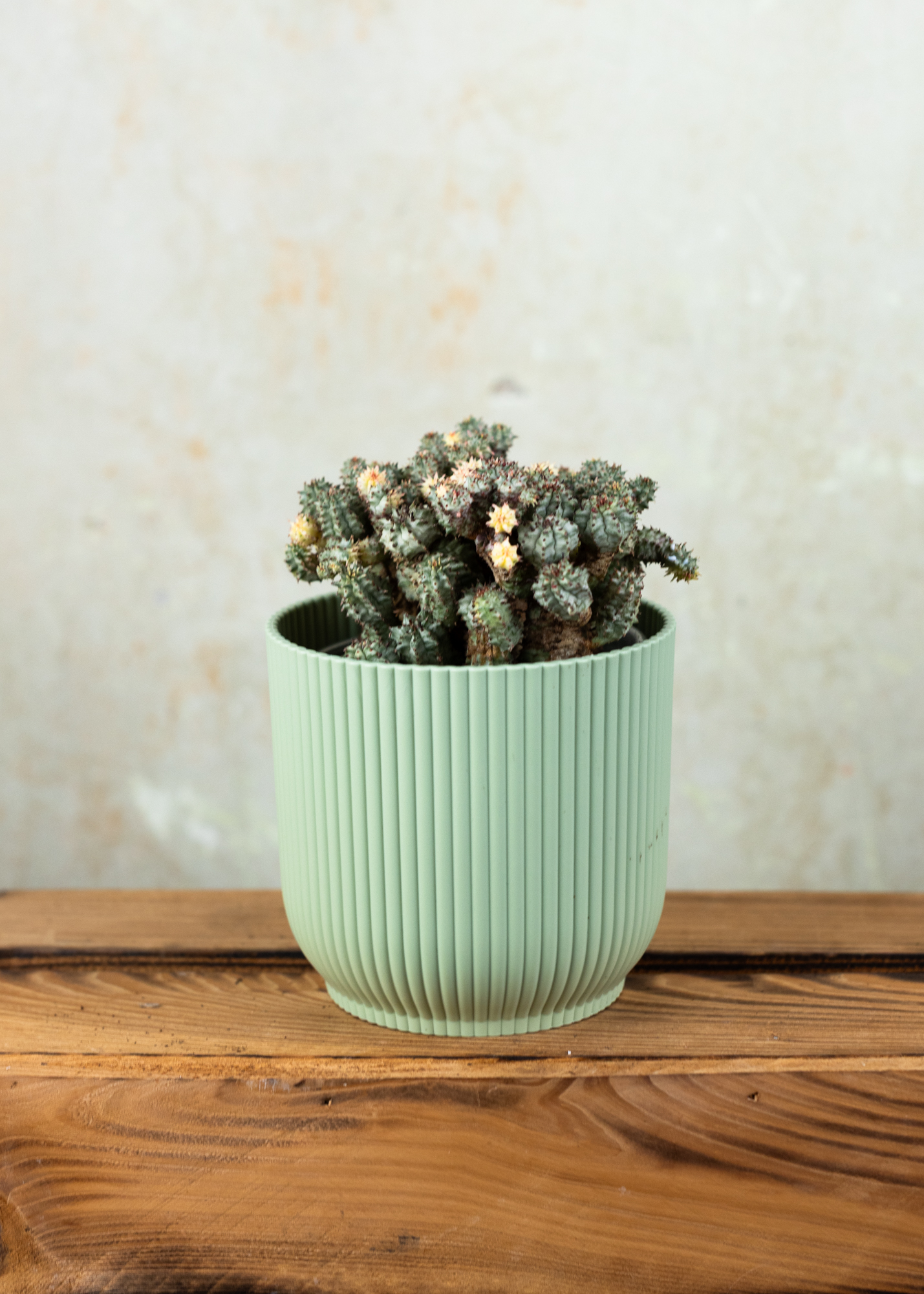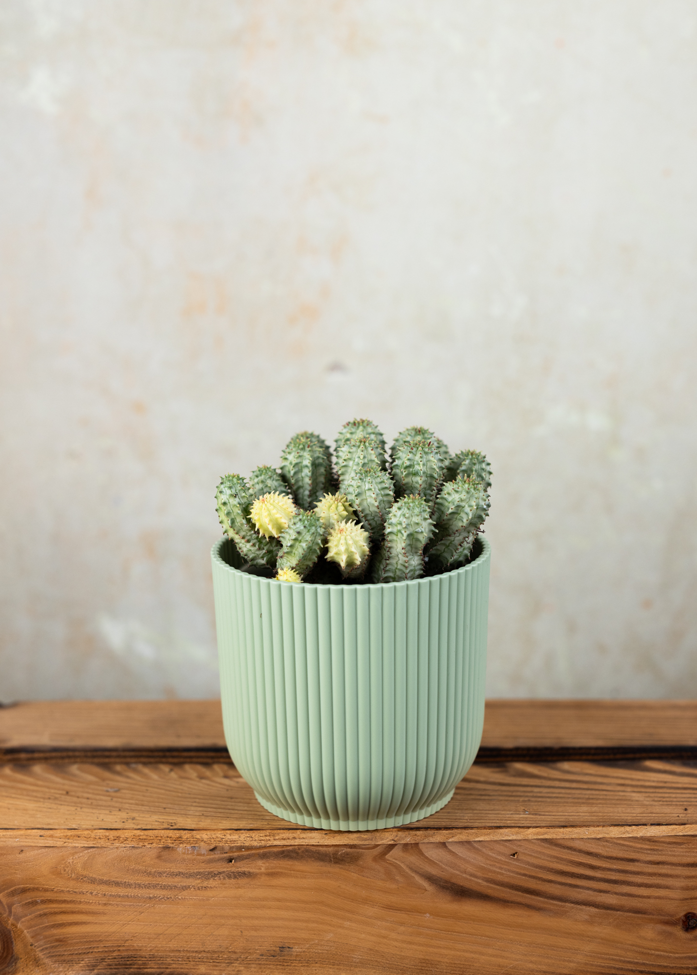 Die Euphorbia submammillaris variegata ist eine seltene und außergewöhnlich schöne Sukkulente, die durch ihre auffällige Panaschierung und skulpturale Wuchsform besticht. Ihre verzweigten, säulenförmigen Triebe zeigen ein Farbspiel aus zartem Grün, Cremeweiß und Gelb, das je nach Lichteinfall unterschiedlich schimmert. Durch ihre kompakte, strukturierte Form erinnert sie an eine Miniatur-Kaktee – nur ganz ohne Stacheln.