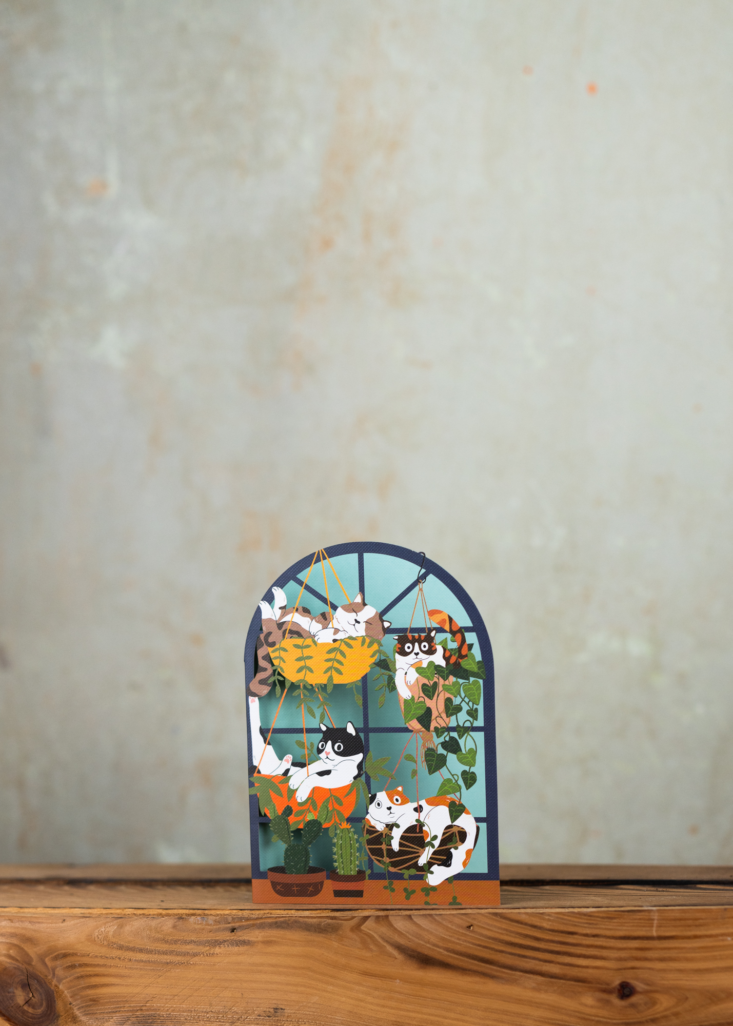 Grußkarte Fenster mit Hängepflanzen und Katzen