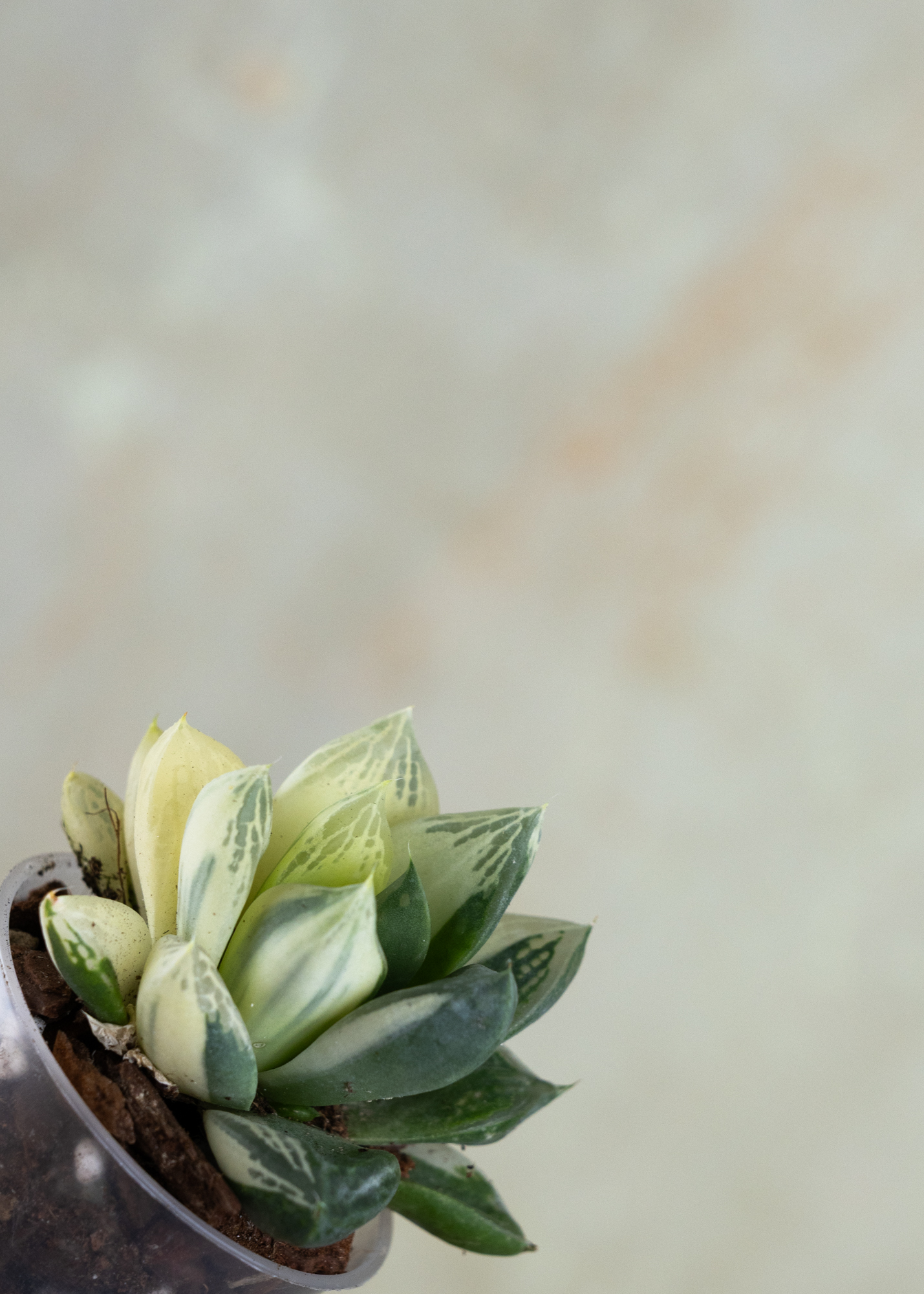 Die Haworthia variegata ist eine bezaubernde, kompakt wachsende Sukkulente mit einer wunderschönen, natürlichen Panaschierung. Ihre dickfleischigen, spitz zulaufenden Blätter zeigen ein faszinierendes Muster aus Grün, Creme und Weiß, das je nach Lichtintensität unterschiedlich schimmert. Durch ihre kompakte Rosettenform ist sie ideal für kleine Töpfe, Regale oder sonnige Fensterbänke.