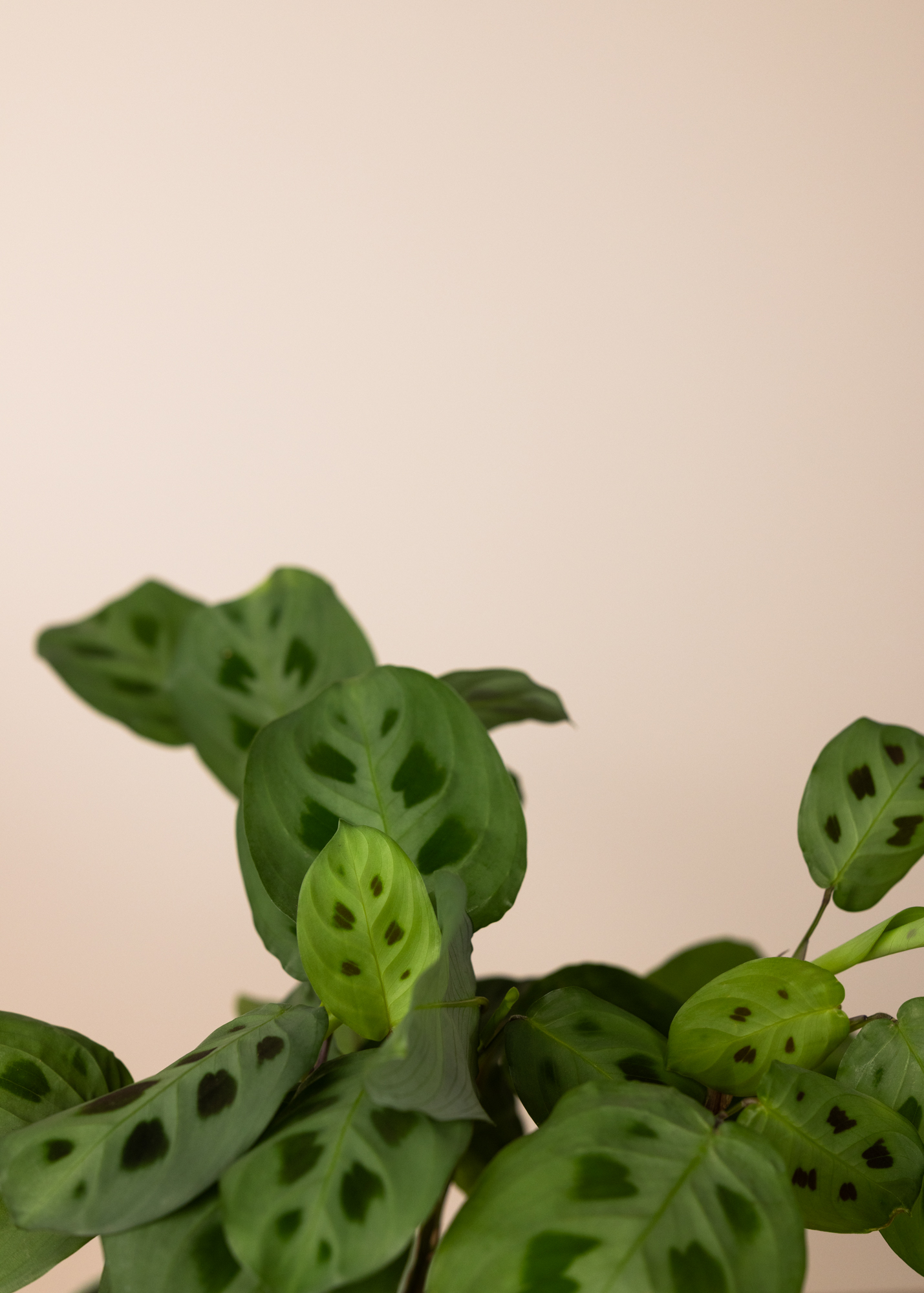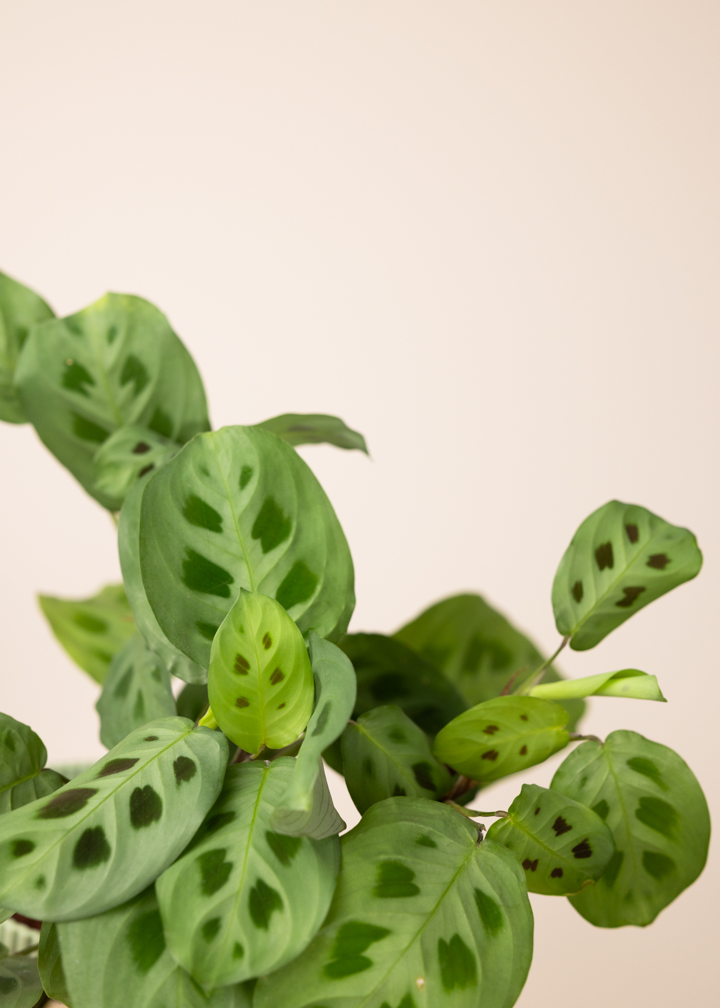 Die Maranta kerchoveana ist eine klassische und zugleich zeitlose Blattschmuckpflanze, bekannt für ihre oval geformten, hellgrünen Blätter mit den charakteristischen dunkelgrünen Flecken entlang der Mittelader. Diese markante Zeichnung verleiht ihr einen ruhigen, natürlichen Look und macht sie zu einem beliebten Vertreter der sogenannten Prayer Plants.
