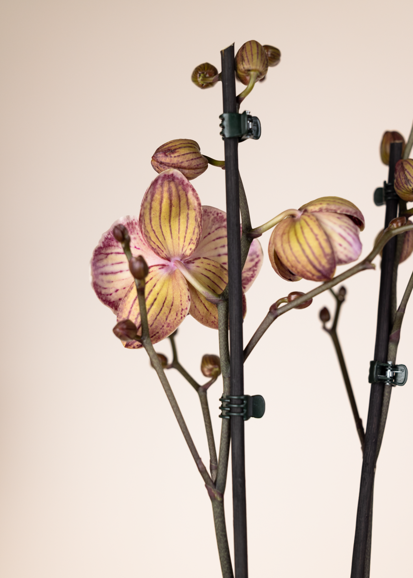 Die Phalaenopsis ‘Paisaje’ ist eine elegante Orchidee mit besonders ausdrucksstarker Blütenzeichnung. Ihre großen, langlebigen Blüten zeigen ein faszinierendes Farbspiel – meist eine Kombination aus zarten Grundtönen mit intensiveren Mustern oder Adern, die jeder Pflanze eine individuelle, fast kunstvolle Optik verleihen.
