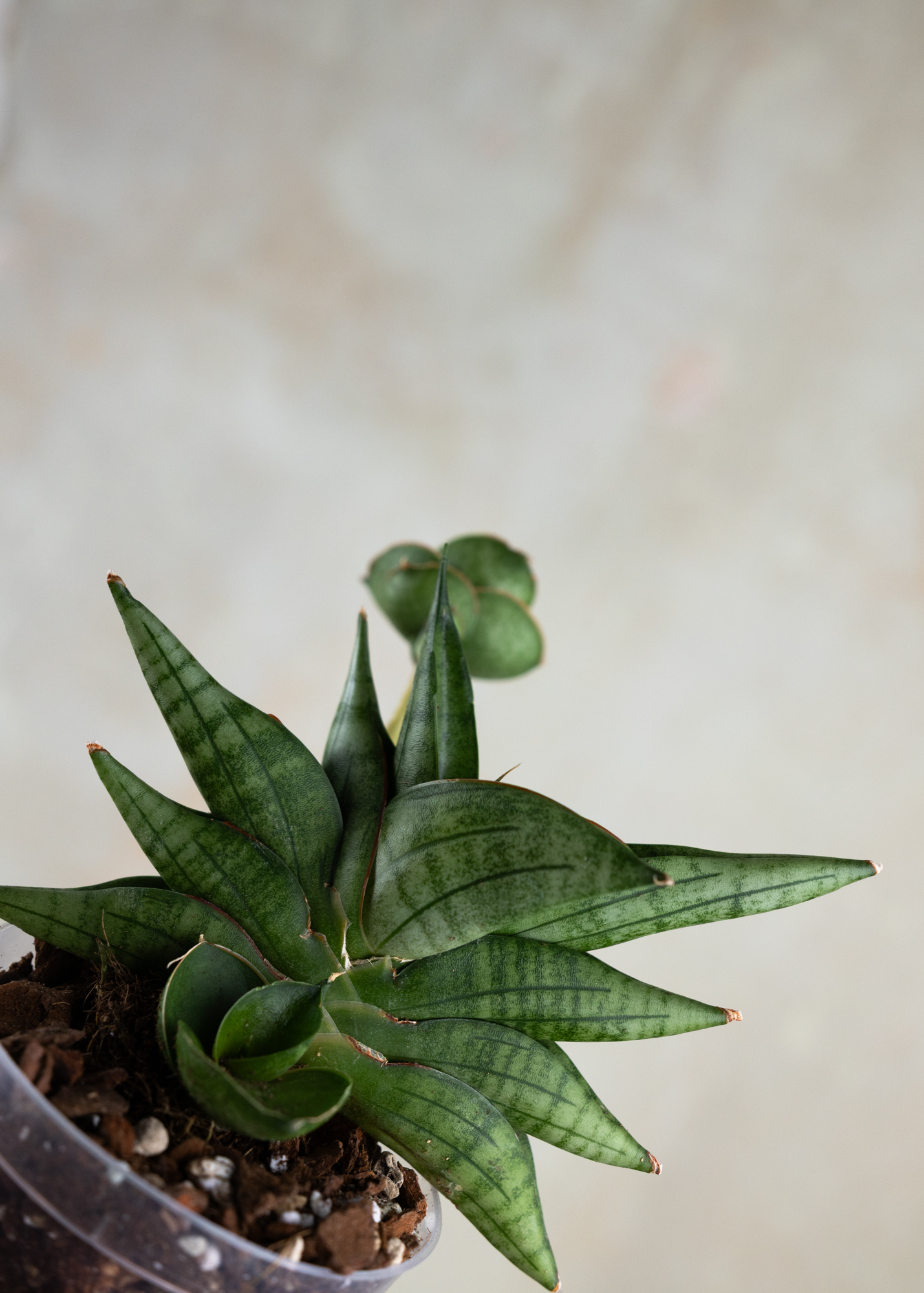 Wie alle Sansevierien ist auch die ‘Almond Jade’ äußerst pflegeleicht und robust. Sie gedeiht bei hellen bis halbschattigen Lichtverhältnissen, benötigt nur wenig Wasser und verbessert zusätzlich die Raumluft. Ideal für Pflanzenliebhaber*innen mit wenig Zeit, aber viel Sinn für Stil und Qualität.