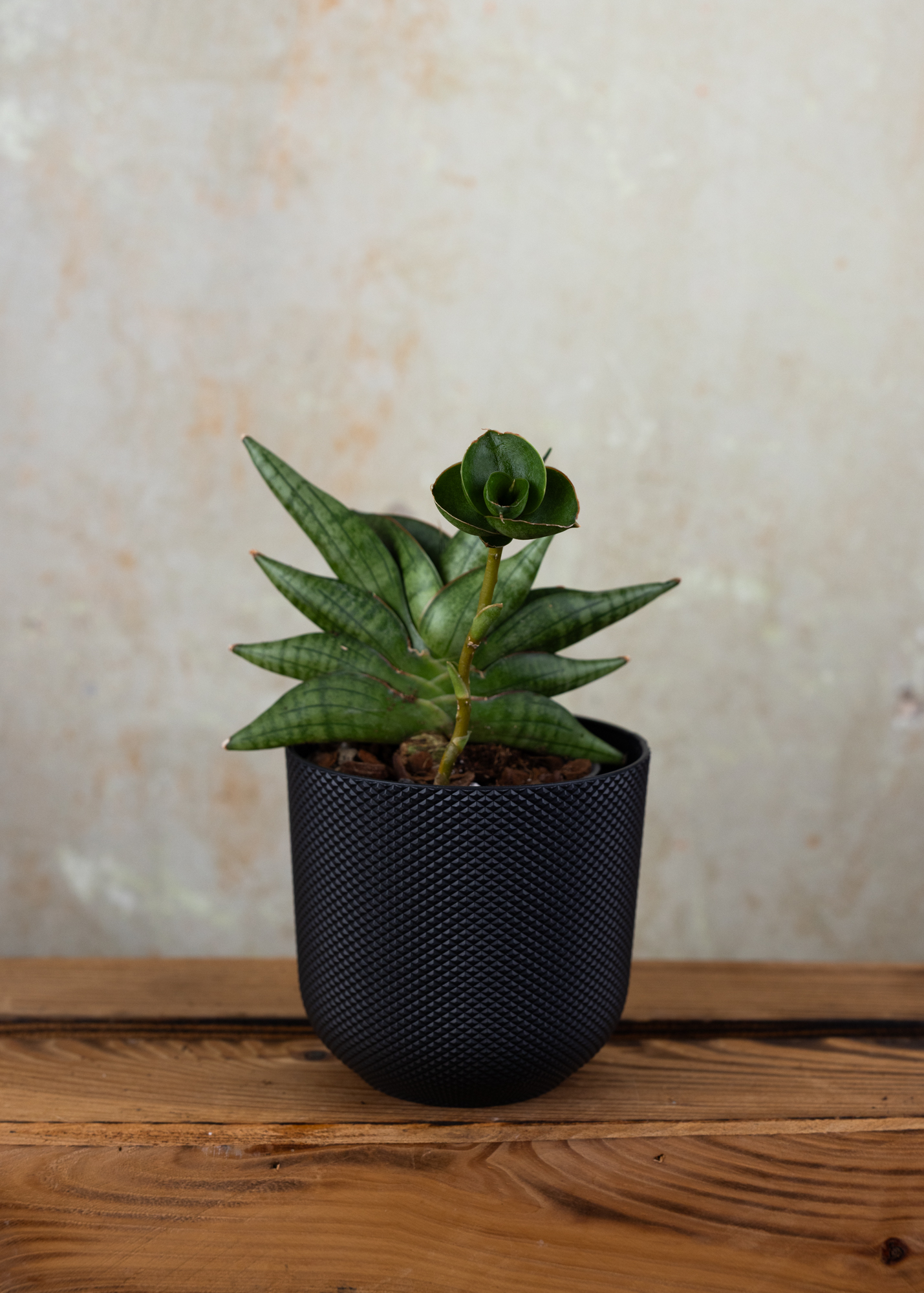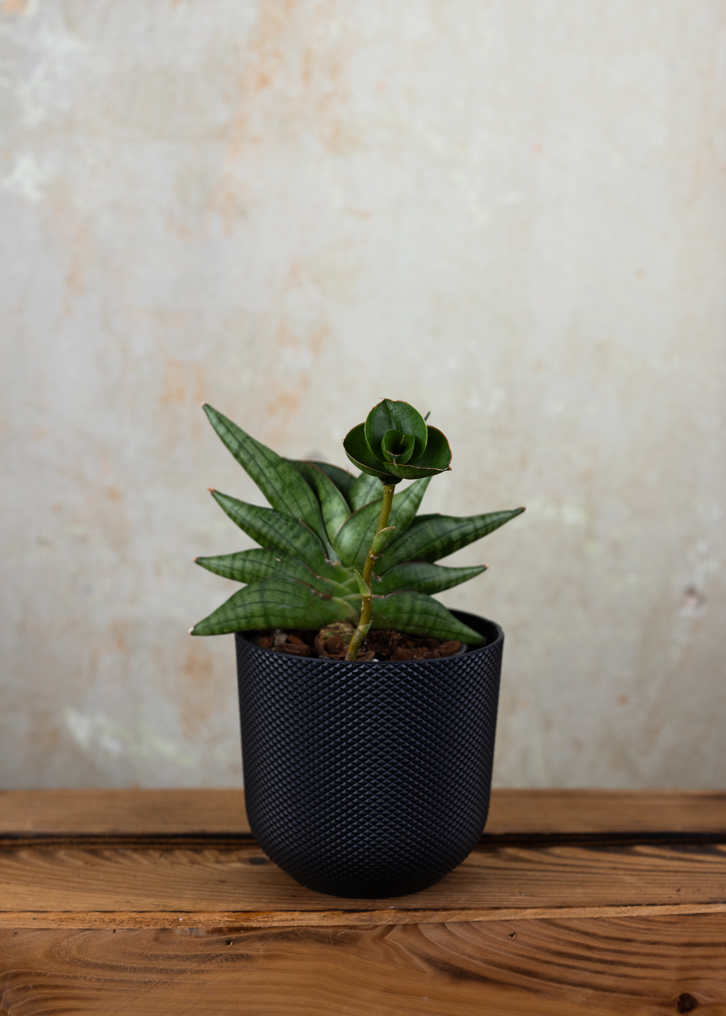 Die Sansevieria ‘Almond Jade’ ist eine elegante, kompakt wachsende Schlangenpflanze mit harmonischer Farbgebung und modernem Look. Ihre dicken, aufrecht stehenden Blätter zeigen ein sanftes Farbspiel aus jadegrünen und olivfarbenen Tönen mit feiner, natürlicher Zeichnung – schlicht, aber eindrucksvoll. Durch ihren gleichmäßigen Wuchs wirkt sie besonders ästhetisch und fügt sich perfekt in jedes Interior-Konzept ein.