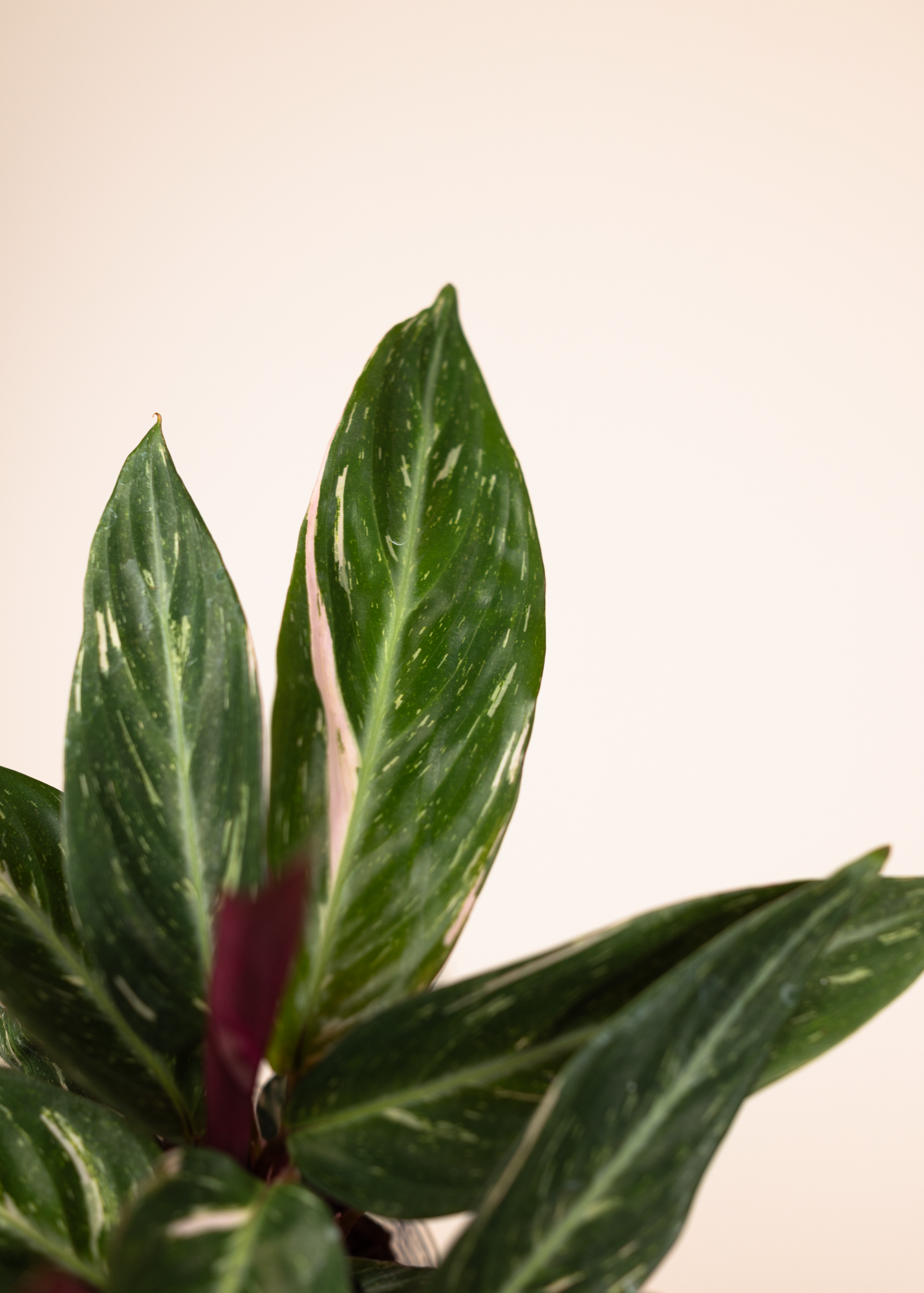 Die Blattunterseiten zeigen oft einen rötlichen bis purpurfarbenen Ton, was für einen zusätzlichen spannenden Kontrast sorgt. Durch diese Kombination wirkt die Pflanze lebendig, modern und zugleich elegant.