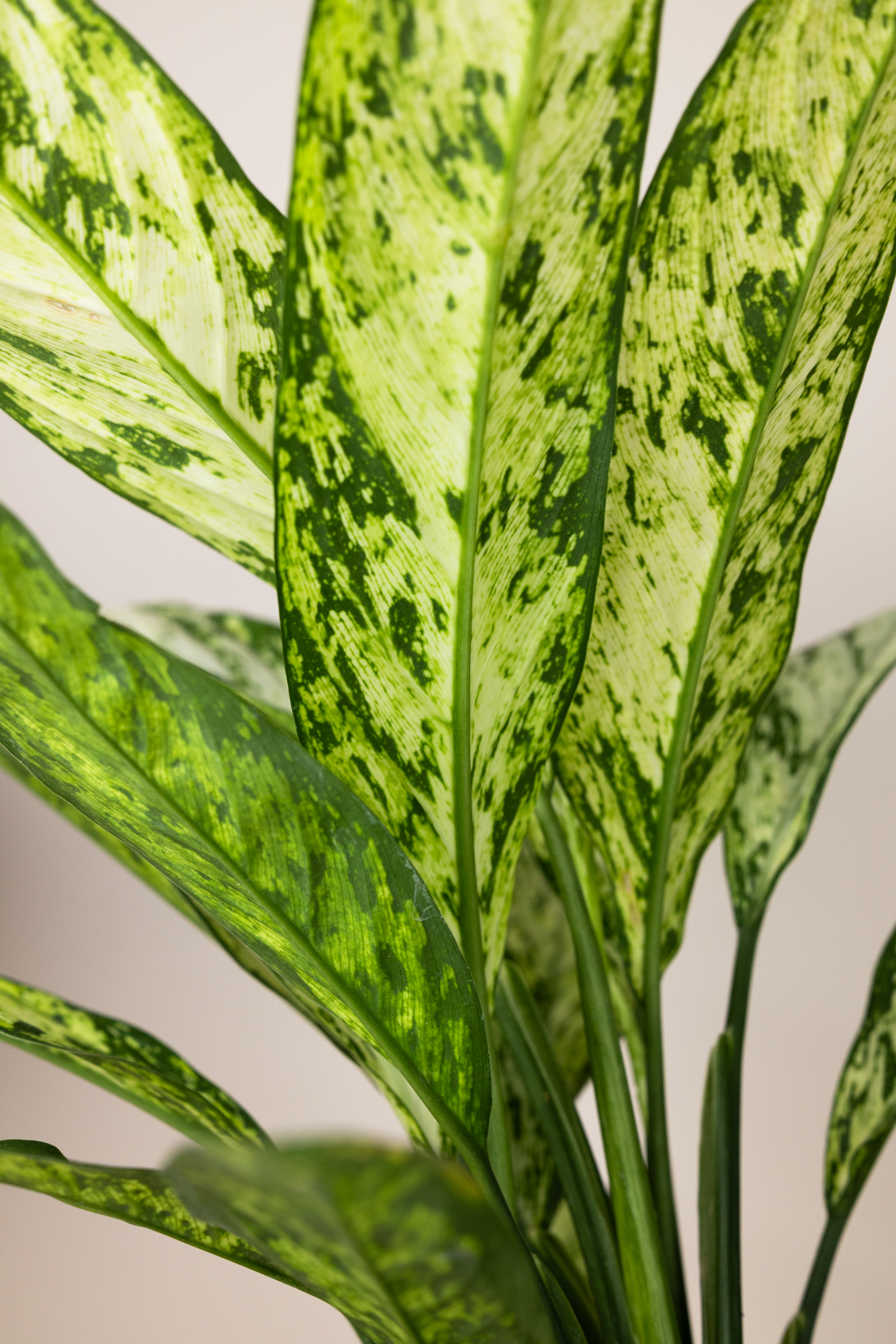 Die Dieffenbachia ‘Vesuvius’ ist eine ausdrucksstarke Blattschmuckpflanze mit großen, länglich-ovalen Blättern, die von einer lebhaften Zeichnung aus Grün, Creme und gelblichen Sprenkeln durchzogen sind. Die dynamische Musterung erinnert an fließende Lava – kraftvoll, kontrastreich und absoluter Blickfang.